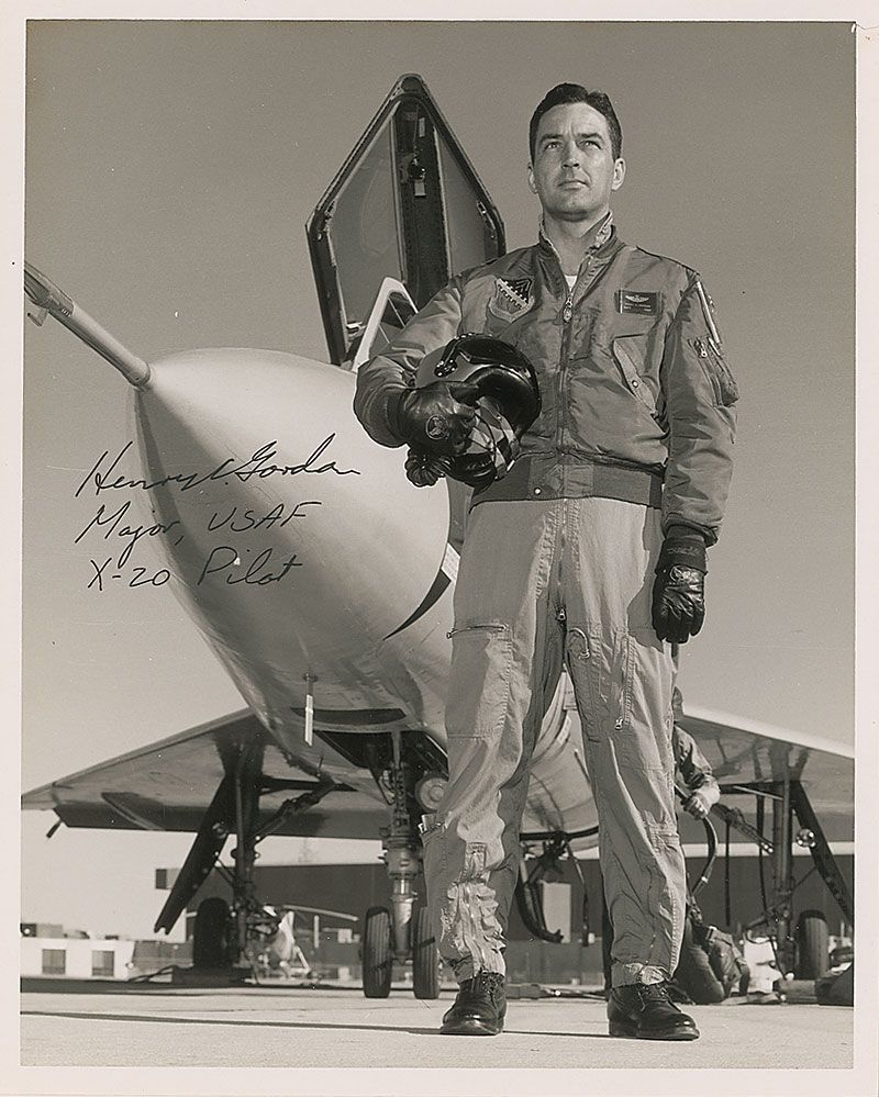 Glossy 8 x 10 photo of Gordon in front of his plane, signed in black felt tip, “Henry C. Gordon, Major, USAF, X-20 Pilot.” In fine condition, with a few slight surface creases.