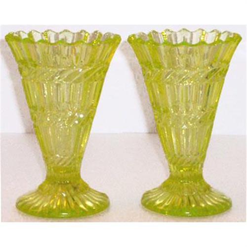 A very rare early 20th or late 19th century pair of glowing vaseline pressed glass vases produced by the Greener Glass Works of Sunderland, North East England. With an intricately pressed pattern of sawtooth fluted rims, faceted and braided bodies that lead to petalled feet, both of these stunning 5 1/2" vases are in excellent condition.
