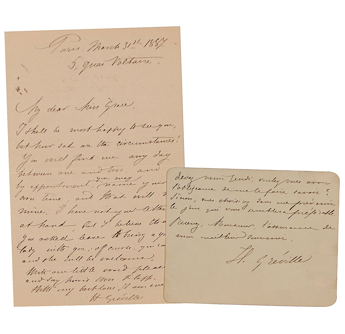 Pen name for Alice Durand (1842–1902), a French writer. Best known for her novel Dosia, which won the Montbon award. Two letters, both signed “H. Greville.” ALS in English, 4.5 x 7, one page, March 31, 1887. Letter to “Miss Grace” regarding a visit; and an ALS in French, 4.5 x 3.5 card, both sides, October 22, 1888. A letter attempting to set up a meeting. In fine condition, with light mirroring of ink to English letter and some adhesive remnants on the reverse of the French ALS.