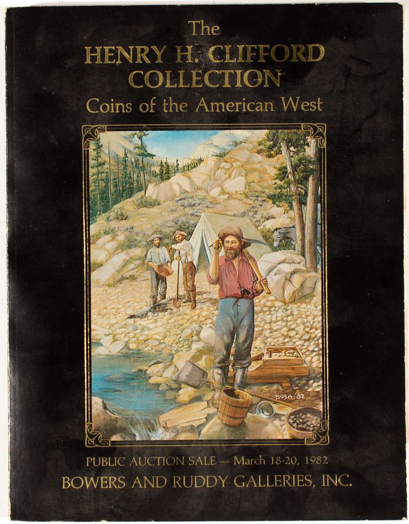 1982 Coinage of the American West Featuring the Collection of Henry H. Clifford, past president of the California Historical Society and other important properties. Public auction sale March 18-20 1982. Bowers and Ruddy Galleries. The auction included Territorial gold and patterns, ingots, bars, token, books, US coins and Americana. There is some wear on the cover of the catalog. Totheroh Collection HKA#63743