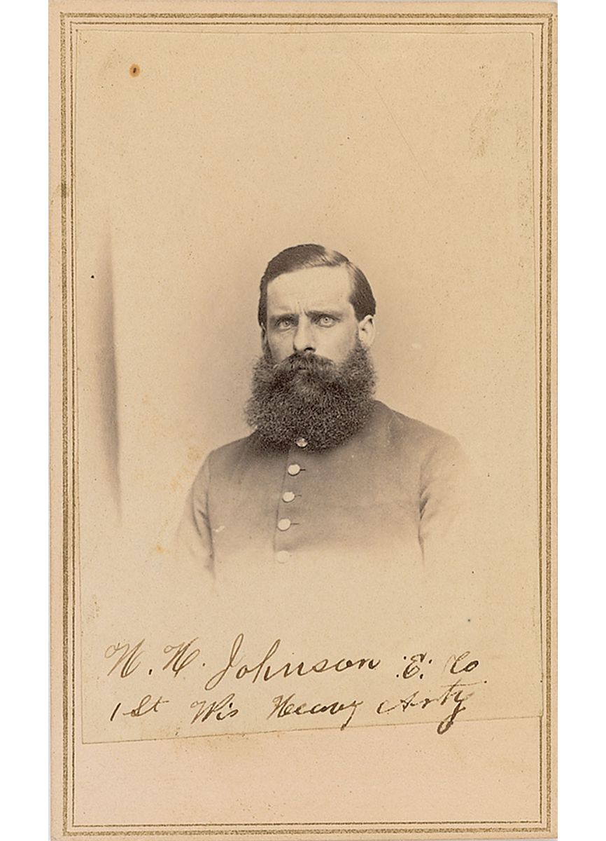 Union officer who served in the 1st Wisconsin Heavy Artillery. Original 2.25 x 3.75 carte-de-visite photo by an anonymous studio, signed below the image in black ink, “H. H. Johnson, ‘E’ Co., 1st Wis. Heavy Arty.” In fine condition, with a couple trivial spots.