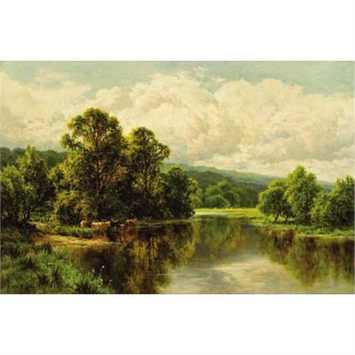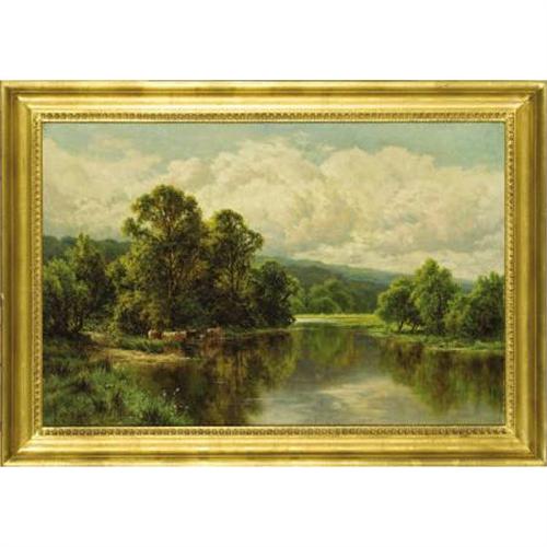 <B>HENRY H. PARKER (British, 1858-1930)</B></I><BR><I>Cattle at the River</B></I><BR>Oil on canvas<BR>20 x 30 inches (50.8 x 76.2 cm)<BR>Signed lower left: <I>Henry H. Parker</B></I><BR> <B>Condition Report:</B> Minor frame abrasions, small area of inpainting at lower right edge.<BR><BR><b>Shipping:</b> Framed - without Glass, Medium (<a target="_blank" href="http://www.heritageauctions.com/common/shipping.php">view shipping information</a>)