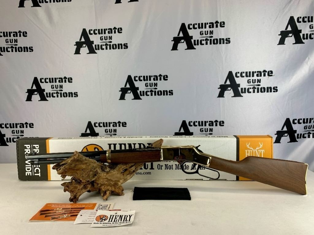 With an overall length of 38", this gold-plated Henry comes with the original box and papers, adjustable rear sight, static front sight, gold-plated metal buttplate, and the wooden furniture is in perfect