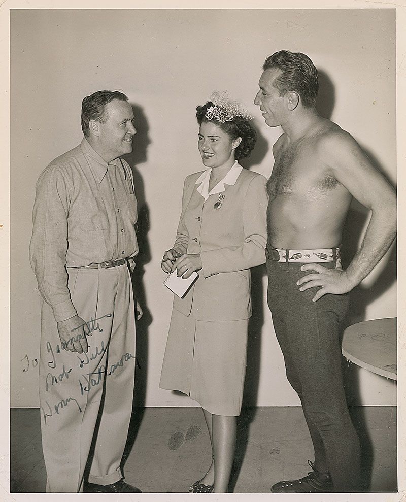 American film director and producer (1898–1985) best known for his westerns, especially those starring Randolph Scott and John Wayne. Scarce glossy 8 x 10 photo of Hathaway with wrestler-actor Mike Mazurki and his wife Jeanette, signed and inscribed in black felt tip, “To Jeannette, Nob Hill, Henry Hathaway.” Scattered light creasing to edges and surface impressions to image from writing on reverse, otherwise fine condition.