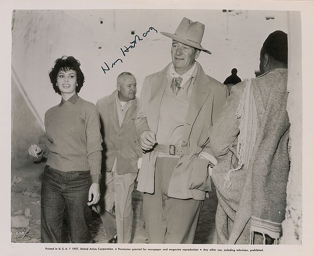 American film director and producer (1898–1985) best known for his westerns, especially those starring Randolph Scott and John Wayne. Glossy 10 x 8 United Artists publicity photo of Hathaway walking behind John Wayne and Sophia Loren during the filming of Legend of the Lost, signed in black felt tip by Hathaway. In fine condition.