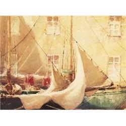 Henry Hobart Nichols (American, 1869-1962), “Mending the Sails”, c. 1940; watercolor/paper, 21” x 29”, signed. Nichols was President of the National Academy of Design; he was also director of the Tiffany Foundation and a trustee of the Metropolitan Museum. He was a member of the Lotus Club, New York Watercolor Club, and the Pennsylvania Academy of Fine Arts. His work is in the collections of the Metropolitan Museum, Corcoran Gallery, National Gallery of Art, and the Museum of Natural History.