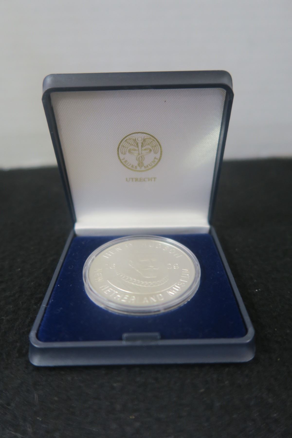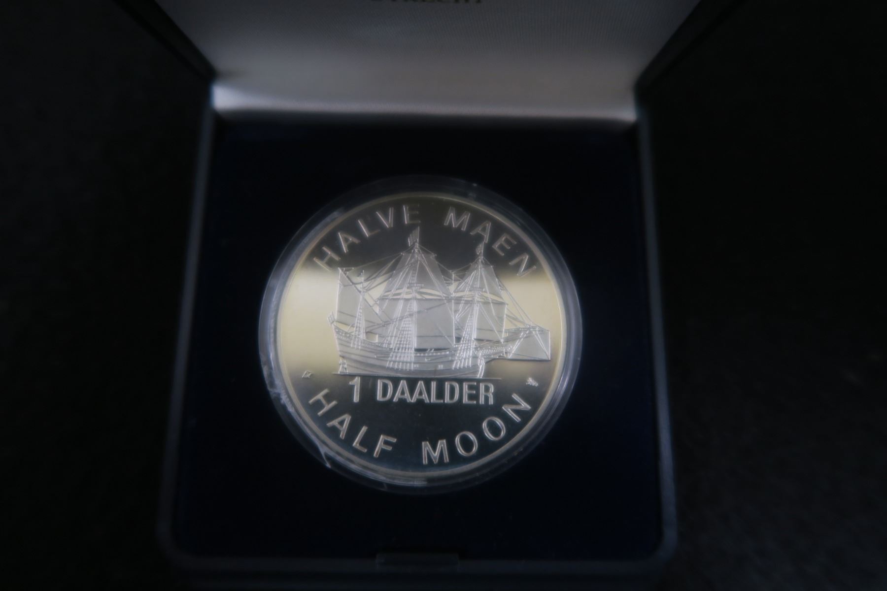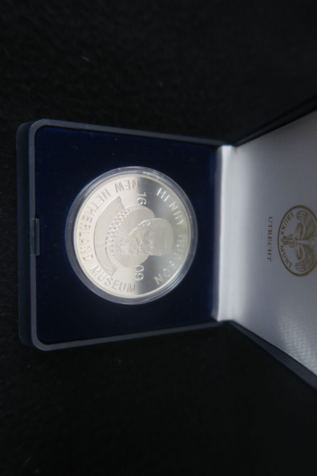 Henry Hudson silver 1 Daalder. Issued by the Utrecht Mint in the Netherlands in 2009 to celebrate the 400th anniversary of Hudson’s famous voyages up the Hudson River in 1609. Coin depicts Hudson and his ship Halve Maen (Half Moon). Housed in its original case of issue.
