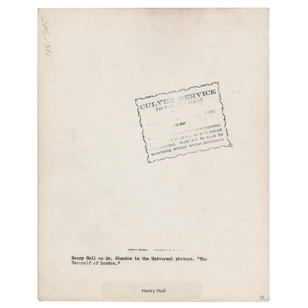 Vintage glossy 8 x 10.25 publicity photo of Henry Hull as Dr. Wilfred Glendon in the 1935 horror film Werewolf of London, signed and inscribed in fountain pen, "To Joe, Sincerely, Henry Hull, 1936.” Reverse bears a Culver Service stamp. In fine condition.