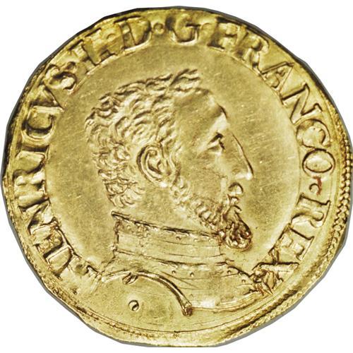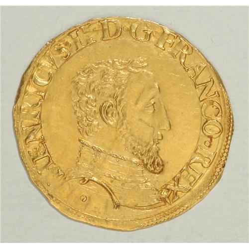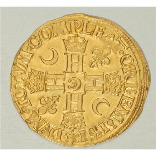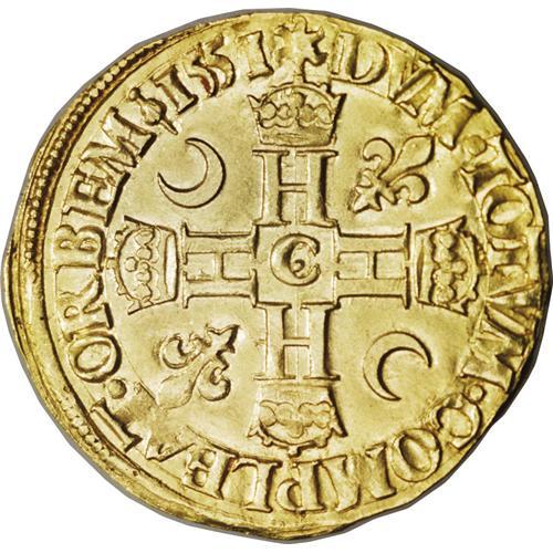 <B>Henry II gold Henri d'or 1551C (St.Lo), 1st type,</B></I> Armored bust right/Cross of four H's with two crescents and two lis in the angles, F-368, Dup-972, Ciani-1244, 3.63 gm, brilliant UNC with a few minor hairlines. Very rare in this exceptional condition. Ex. Christie's Gallia sale, London, October 6, 1987, lot 163. The original Christie's sale envelope is included.<BR><I>From the Sanssouci Collection</B></I><BR><BR><b>Shipping:</b> Coin/Currency (<a target="_blank" href="http://www.heritageauctions.com/common/shipping.php">view shipping information</a>)