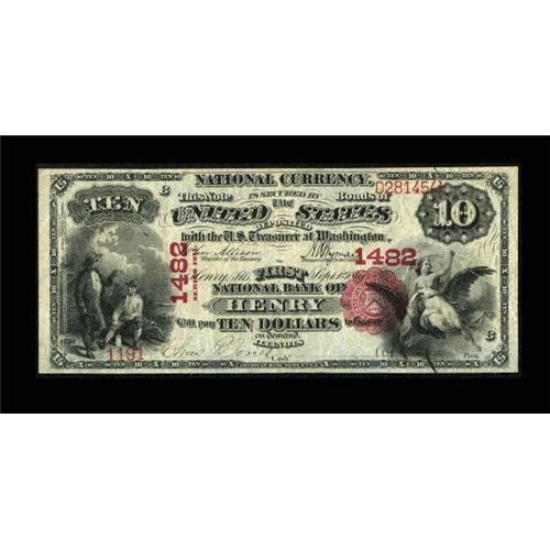 <B>Henry, IL</B></I> - $10 1875 Fr. 417 <B>The First NB</B></I> Ch. # 1482<BR> This is the only Series of 1875 example reported in the Kelly census and very scarce as such. The note has plenty of eye appeal with bright colors and strong signatures. <I>ex-Lynn Shaw, ex-Gary Lonnon</B></I>. <B>Very Fine</B></I>. <BR><BR><b>Shipping:</b> Coins & Currency (<a target="_blank" href="http://www.heritageauctions.com/common/shipping.php">view shipping information</a>)