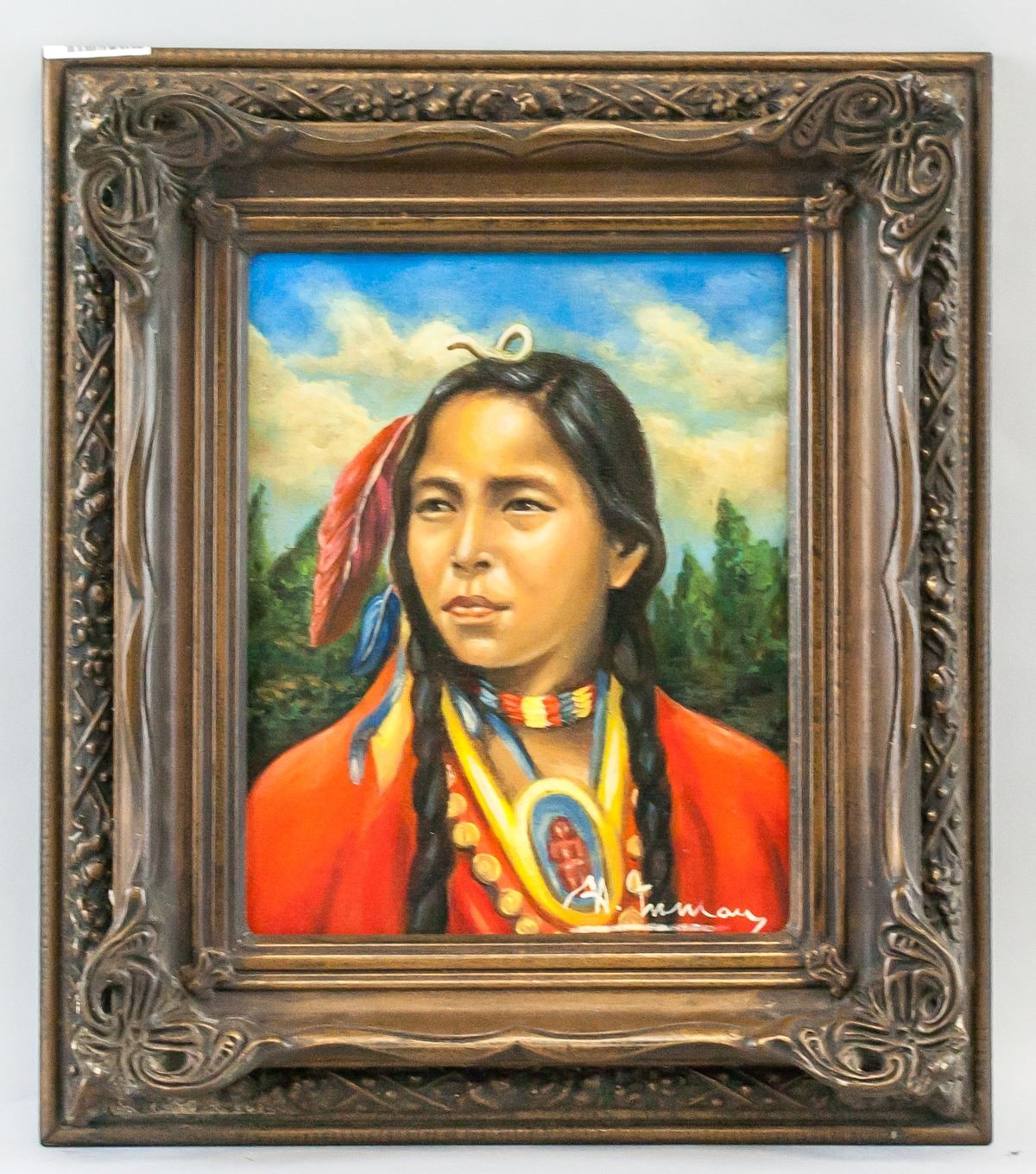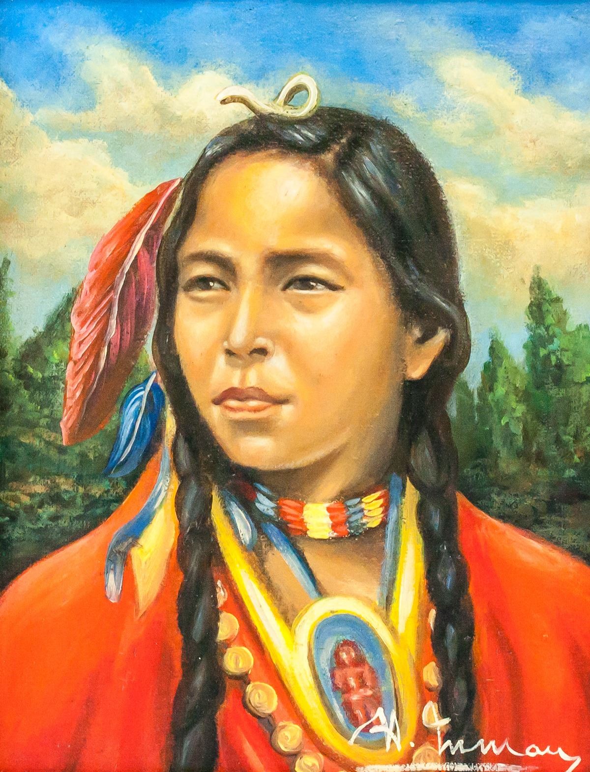 Oil on canvas, framed. Featuring a portrait of an Indian matriarch. Signed H. Inman on the lower right corner. In pencil illegibly inscribed on the stretcher bar. Attributed to Henry Inman (1801-1846, American). 31 x 24 cm (12.2 x 9.5 inches. Framed size: 46 x 40 cm (18.1 x 15.8 inches). PROVENANCE: This lot carries limited provenance from a Southern Ontario estate