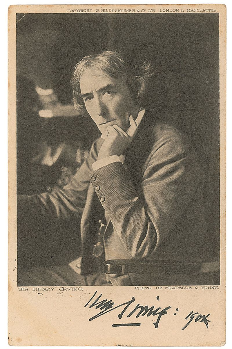 Vintage 3.5 x 5.5 postcard photo, signed in the lower border in black ink, “Henry Irving 1904.” In fine condition, with a bit of scattered light foxing.