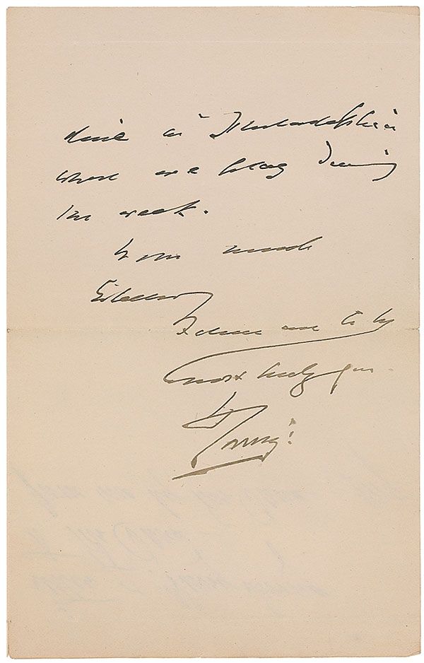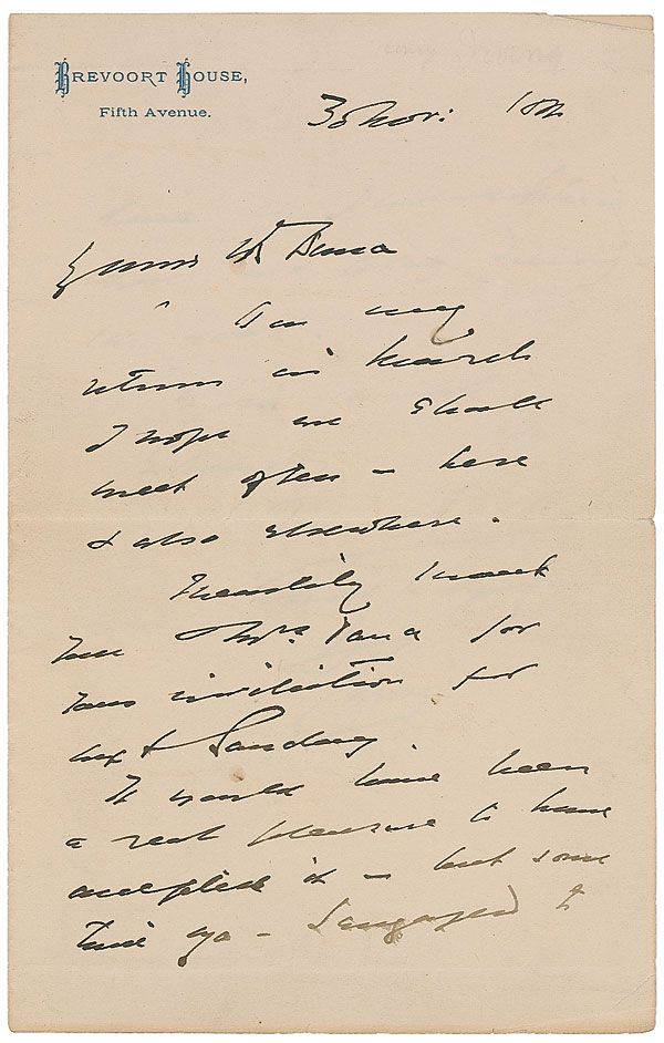 Prominent British stage actor (1838–1905) who was the first of his profession to be knighted. ALS signed “H. Irving,” two pages on two adjoining sheets, 4.5 x 7, Brevoort House letterhead, November 30, 1884. Letter to Mr. Dana. In part: “I hope we shall meet often—here & also elsewhere. I readily thank you Mr Dana for your invitation for next Sunday. It would have been a great pleasure to have accepted it.” In fine condition, with ink notation to reverse of second page, a couple slight brushes to text, and mild toning.