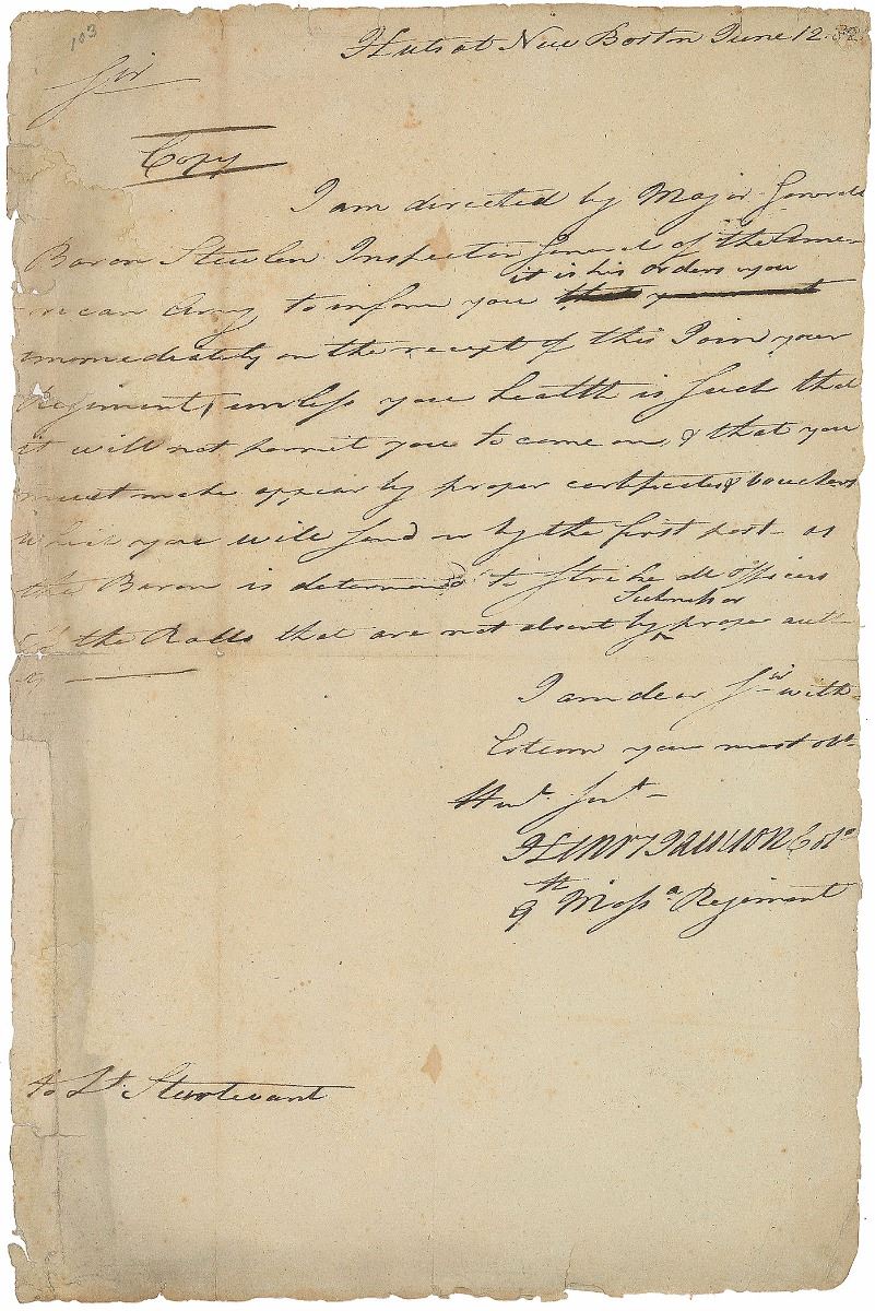 Revolutionary War general from Massachusetts (1747–1809) who led his regiment in the Philadelphia campaign of 1777, at Monmouth and Rhode Island in 1778, and at Springfield, New Jersey, in 1780. Revolutionary War–dated LS, one page, 9 x 14, June 12, 1782. Letter to Lt. Sturtevant, in full: “I am directed by Major General Baron Von Steuben Inspector General of the American Army to inform you it is his orders you immediately on the receipt of this join your regiment unless your health is just that it will nor permit you to come on & that you must make appear by proper certificates & vouchers which you will send on by the first post, as the Baron is determined to strike all officers off the rolls that are not absent by sickness or proper authority.” In very good condition, with overall soiling, wear, and small tears to edges.