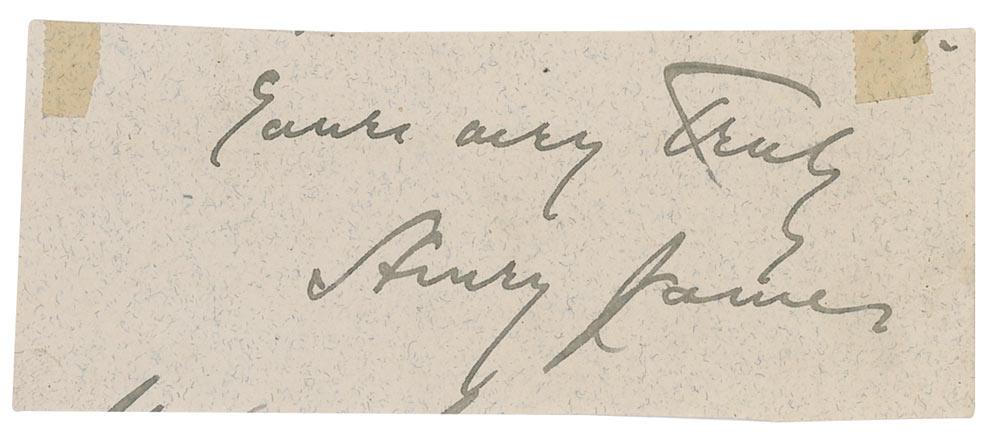 Celebrated American-born writer (1843–1916) who spent much of his literary career in England and who remains best known for his novels exploring Victorian manners and morals, including such classics as Washington Square, The Wings of the Dove, and The Golden Bowl. Fountain pen signature, “Yours very truly, Henry James,” on a light gray 4.25 x 1.5 slip clipped from a larger letter. In fine condition, with small tape remnants to top edge, and a few stray ink marks.