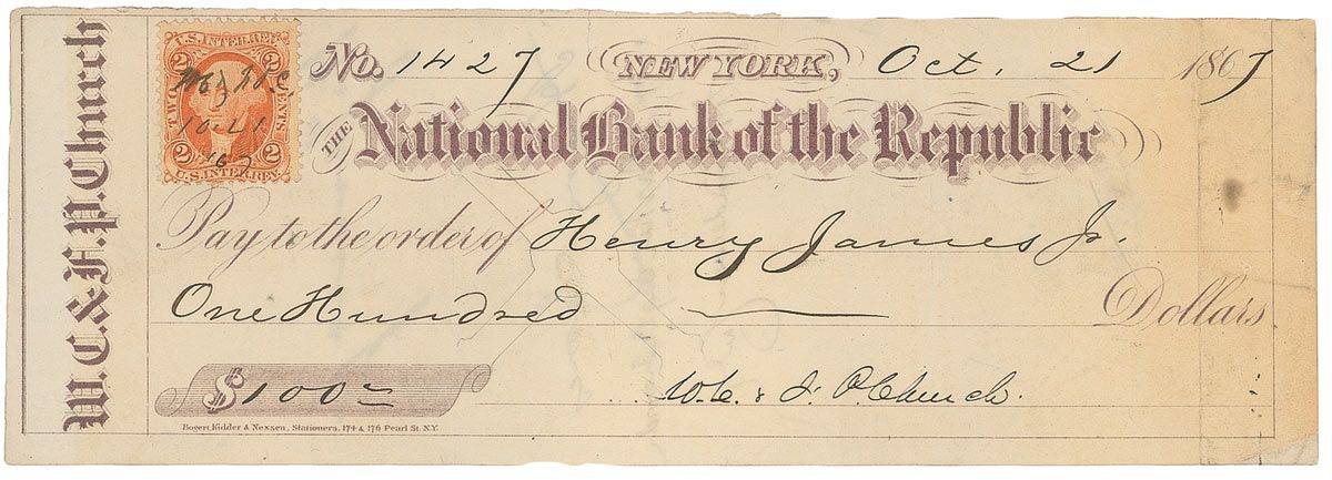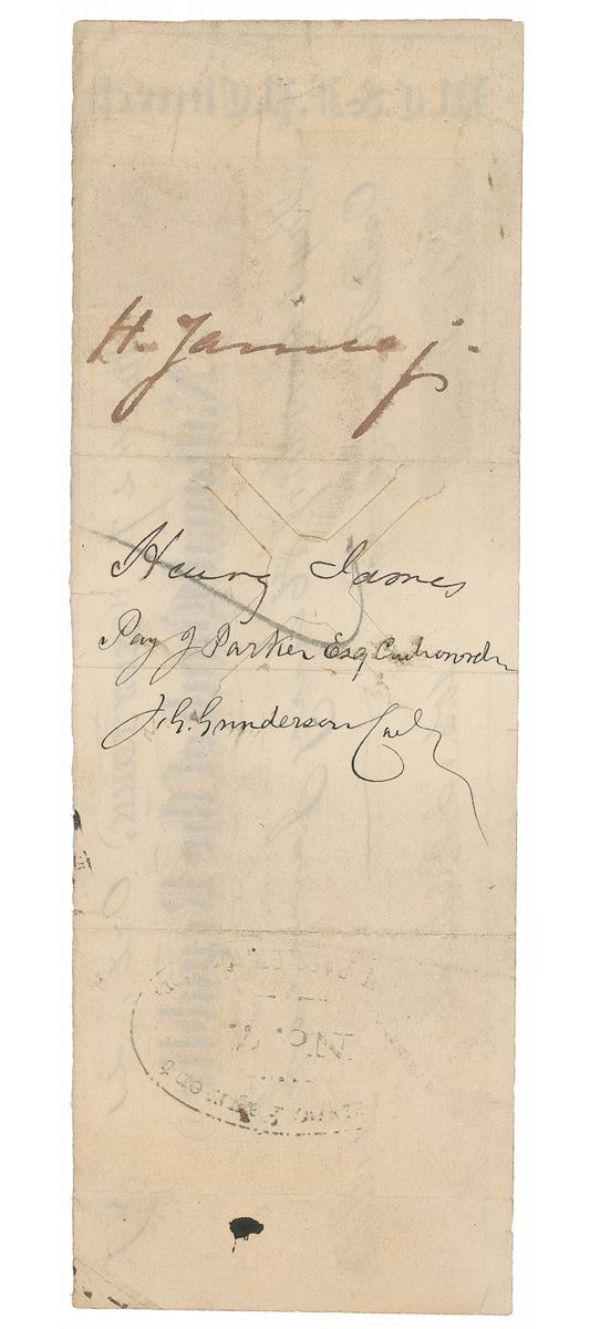 Celebrated American-born writer (1843–1916) who spent much of his literary career in England and who remains best known for his novels exploring Victorian manners and morals, including such classics as Washington Square, The Wings of the Dove, and The Golden Bowl. Endorsed W.C & F.P. Church business check, 7.75 x 2.75, filled out and signed in another hand, payable to Henry James, Jr. for $100.00, October 21, 1867. Endorsed on the reverse, “H. James, Jr.” Several vertical folds, cancellation cut to center, some light feathering to signature, expected stamps, and some light soiling, otherwise very good condition.