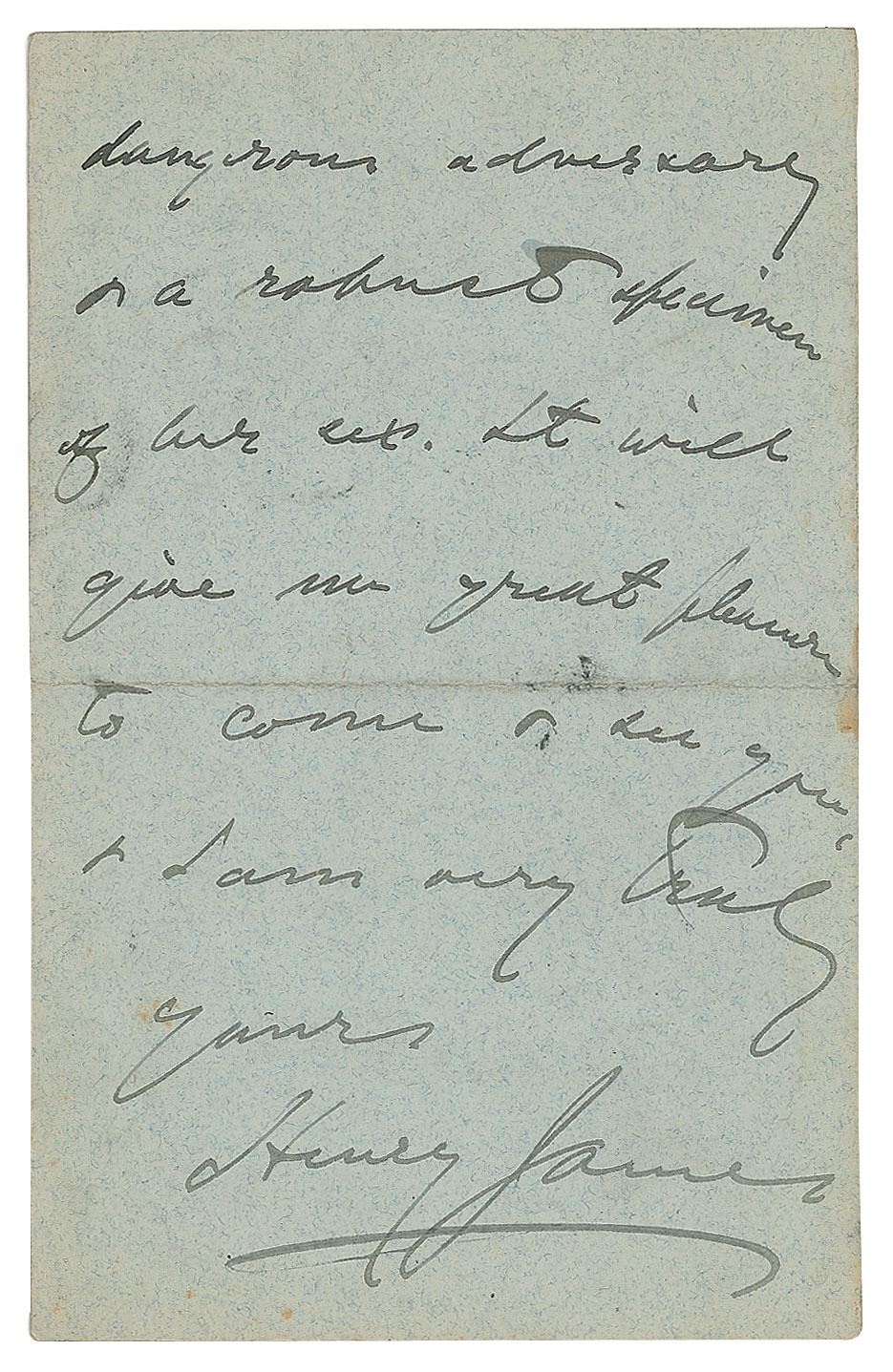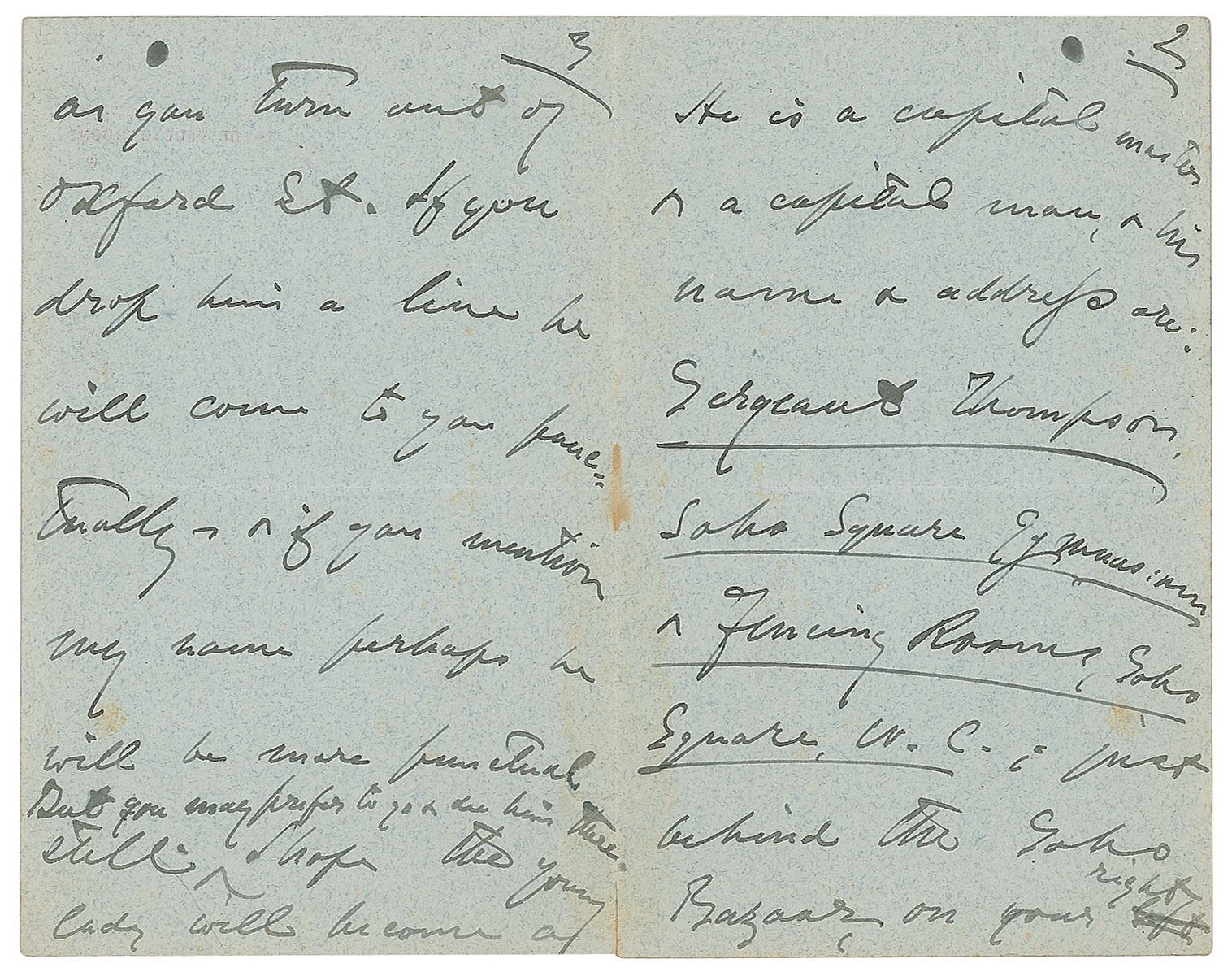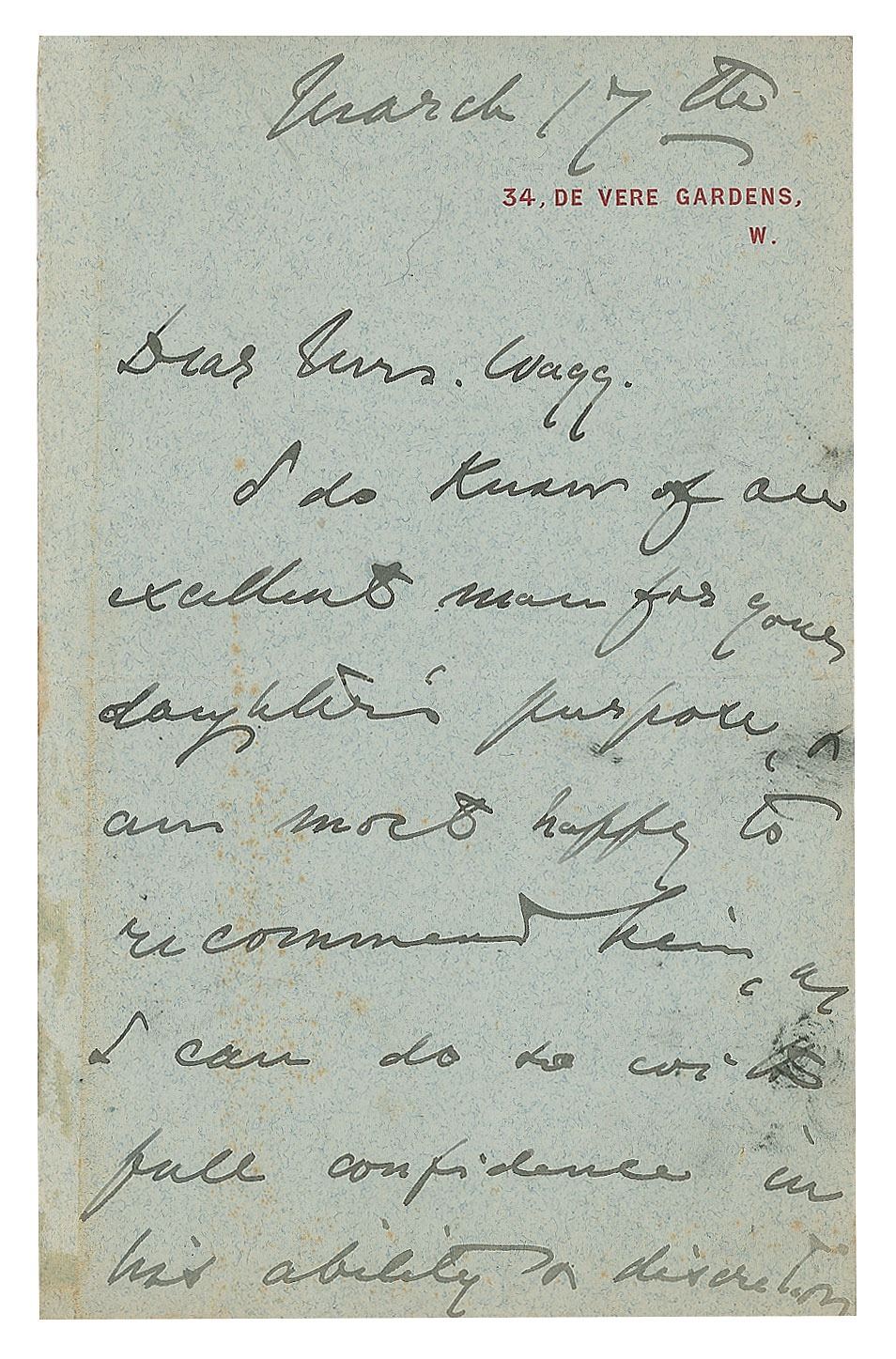 ALS, four pages on two adjoining sheets, 4.5 x 7, March 17, no year. Letter to Mrs. Wagg, in part: "I do know of an excellent man for your daughter's purpose, & am most happy to recommend him. I can do no full confidence in his ability or discretion. He is a capital master & a capital man, & his name & address are: Sergeant Thompson, Soho Square Gymnasium, Fencing Rooms, Soho, Square W. C…behind the Soho Bazaar on your right or you turn out of Oxford St. If you drop him a line he will come to you punctually—or if you mention my name perhaps he will be more punctual. But you may prefer to go & see him there. Still I hope the young lady will become a dangerous adversary or a robust specimen." In very good to fine condition, with some light staining and old adhesive residue to the first page.