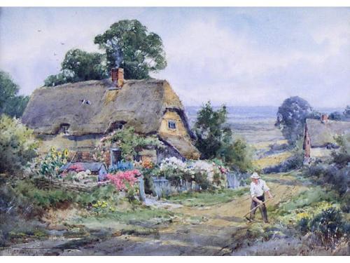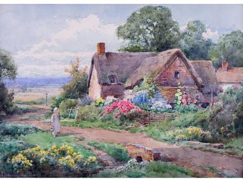 [British, RBA, 1870-1950] AT WICK, NEAR EVESHAM Watercolour on paper 9 1/2 x 13 1/2 ins. -Signed & titled -together with- UNTITLED; STROLL IN THE GARDEN Watercolour on paper 9 1/2 x 13 1/2 ins. -Signed LOT OF TWO