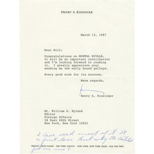 <B>Henry Kissinger Signature Lot</B></I> including a one page typed letter signed "<I>Henry</B></I>", 6.5" x 8.5", on Kissinger's personal letterhead, New York, March 13, 1987, to William G. Hyland, New York. Kissinger has read the bound galleys for Hyland's book Mortal Rivals: Superpower Relations from Nixon to Reagan and writes in part: "Congratulations on MORTAL RIVALS. It will be an important contribution and I'm looking forward to reading it...every good wish for its success". Apparently having had some time to read portions of the galleys Kissinger has hand annotated the letter at the bottom and written: "<I>I have read most of it. It is first class. But why the hatchet job on me?</B></I>". Was this written in jest or? Included are the title page and half-title page excised from Kissinger's book White House Years. On the half-title page Kissinger has inscribed the book to presumably Hyland's wife: "<I>To Dora Hyland Every good with Henry A. Kissinger</B></I>". The pages were paper clipped together at one time and the removal of the clip has left a slight bit of rust and torn a small hole on the inscribed page, else all items are in fine condition.<BR><BR><BR><b>Shipping:</b> Flat Material, Small (<a target="_blank" href="http://www.heritageauctions.com/common/shipping.php">view shipping information</a>)