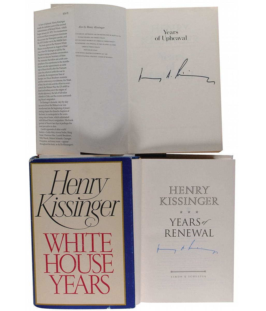 Three hardcover books, each signed on the half-title or title page in felt tip. Books are: White House Years, Years of Upheaval, and Years of Renewal. In overall fine condition.