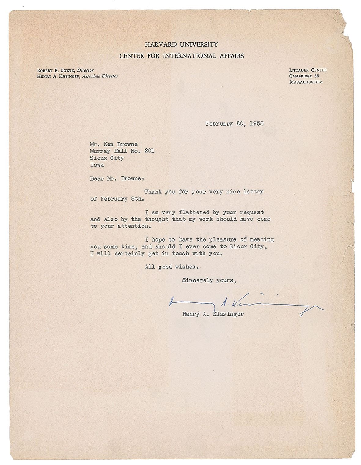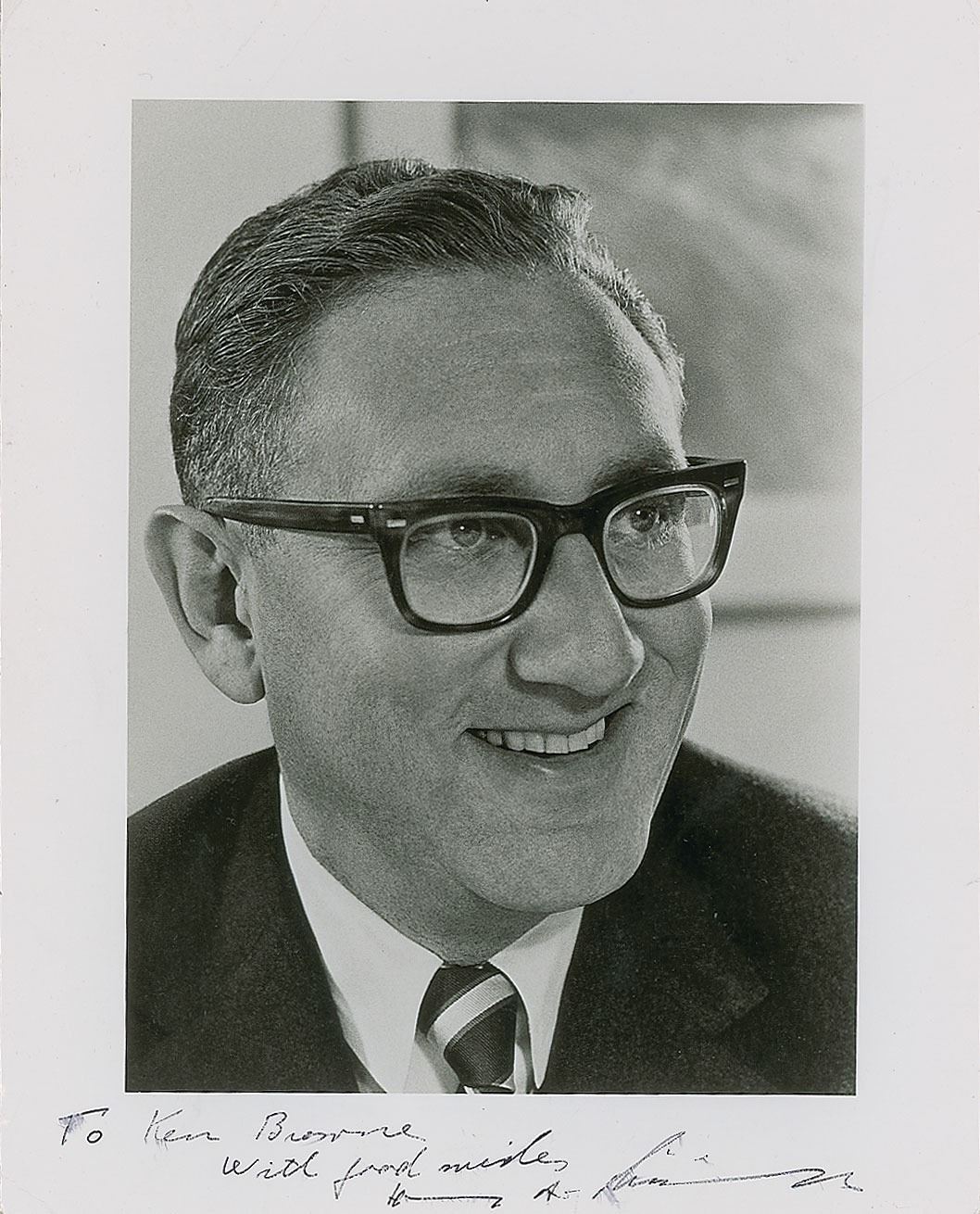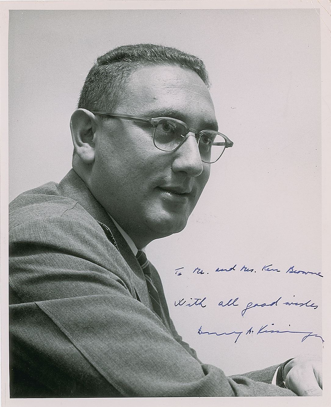 Three items: a very early vintage glossy 8 x 10 photo of the young Kissinger as a member of the Harvard faculty, signed and inscribed in fountain pen, "To Mr. and Mrs. Ken Browne, With all good wishes, Henry A. Kissinger"; a TLS, one page, 8.5 x 11, Harvard University Center for International Affairs letterhead, February 20, 1968, in part: "I am very flattered by your request and also by the thought that my work should have come to your attention"; and a semi-glossy 8 x 10 official White House portrait, signed and inscribed in the lower border in ink, "To Ken Browne, with good wishes, Henry A. Kissinger." In overall very good to fine condition, with edge tears and toning to the letter, paperclip impressions to the top edges of the photos, and light brushing to the signature of the White House portrait. Accompanied by a 1971 transmittal letter from his secretary for the White House photo.