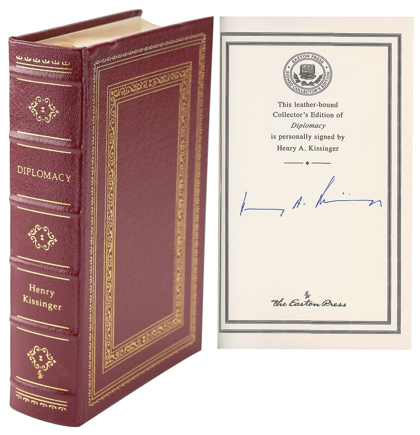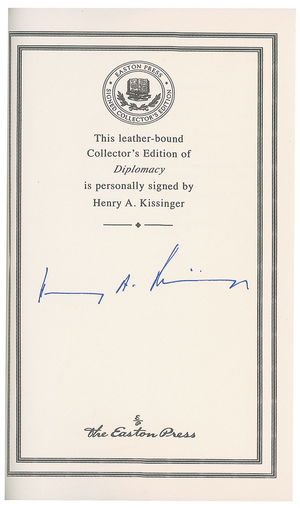 Signed book: Diplomacy. Collector's edition. Norwalk, CT: Easton Press, 1994. Leatherbound hardcover, 6.25 x 9.5, 912 pages. Signed on the colophon in blue ink, "Henry A. Kissinger." In very fine condition.