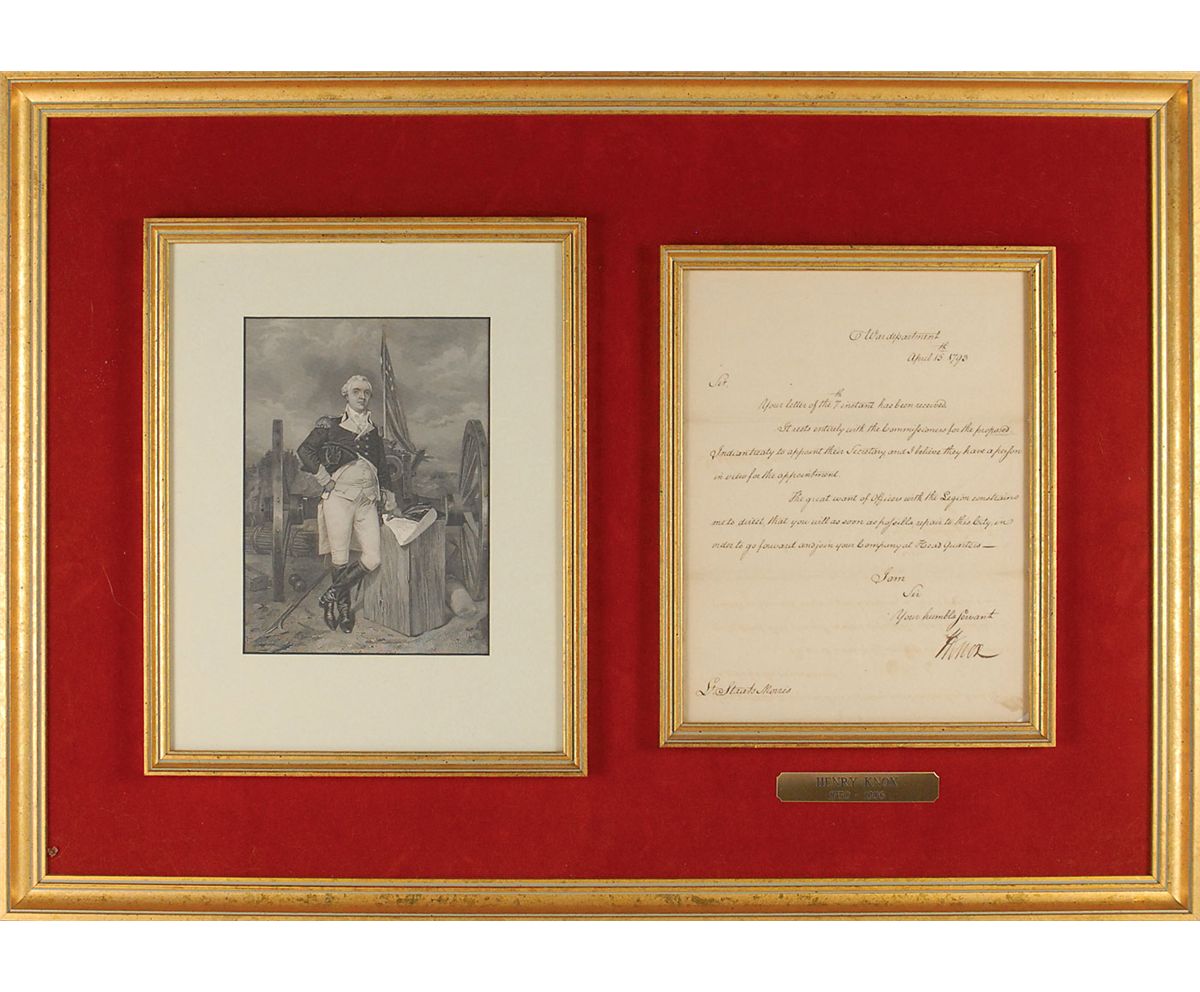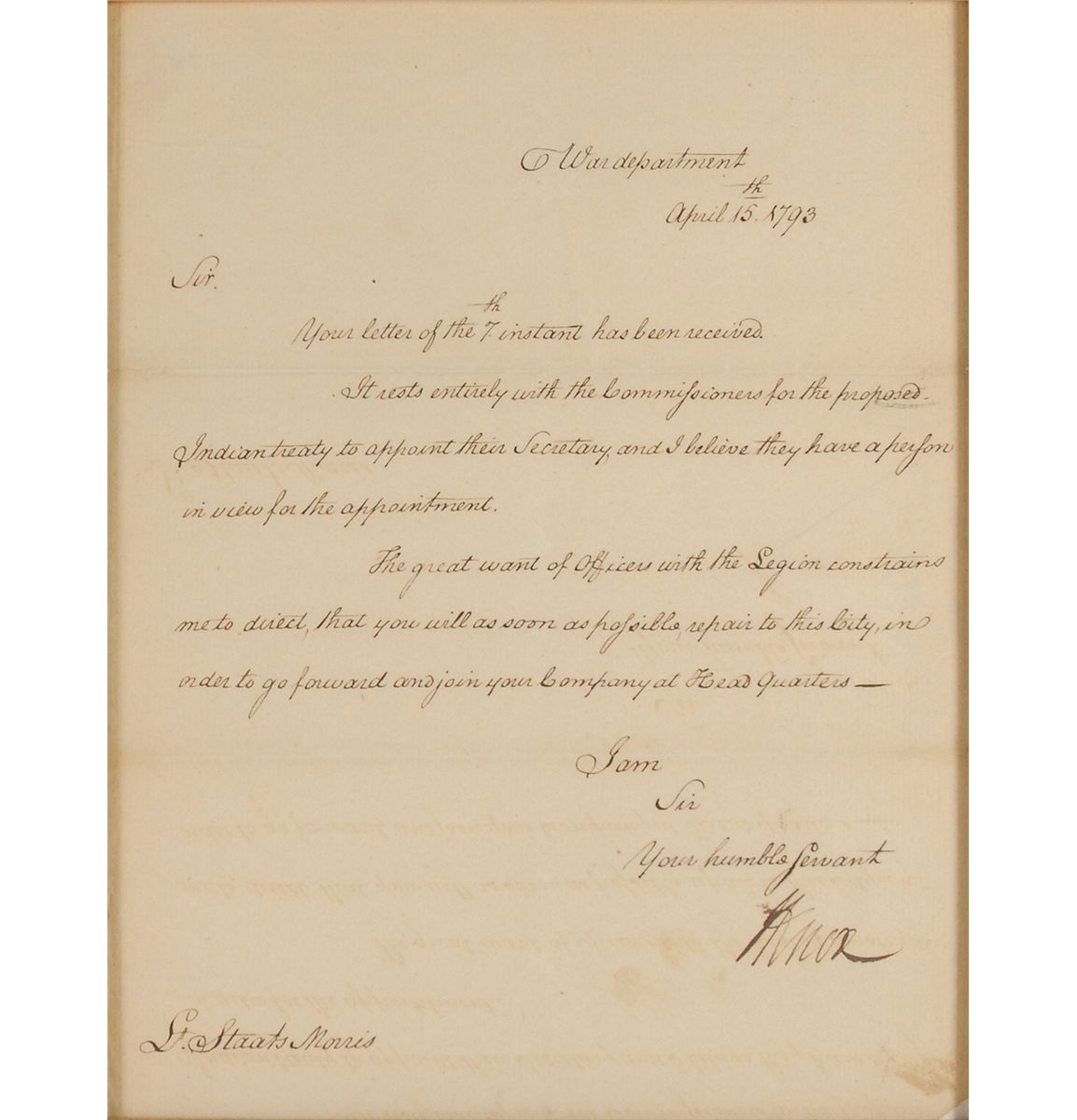 LS signed “H. Knox,” one page, 7.5 x 10, April 15, 1793. Letter to Lieutenant Morris. In part: “It rests entirely with the Commissioners for the proposed Indian treaty to appoint their Secretary and I believe they have a person in view for the appointment. The great want of Officers with the Legion constrains me to direct that you will as soon as possible, repair to this City, in order to go forward and join your Company at Head Quarters.” Framed to an overall size of 8.75 x 11, which is in turn framed with a full-length portrait and a small plaque to an overall size of 26.5 x 18.5. In fine condition, with intersecting folds, and some light mirroring of ink to lower portion from folding.