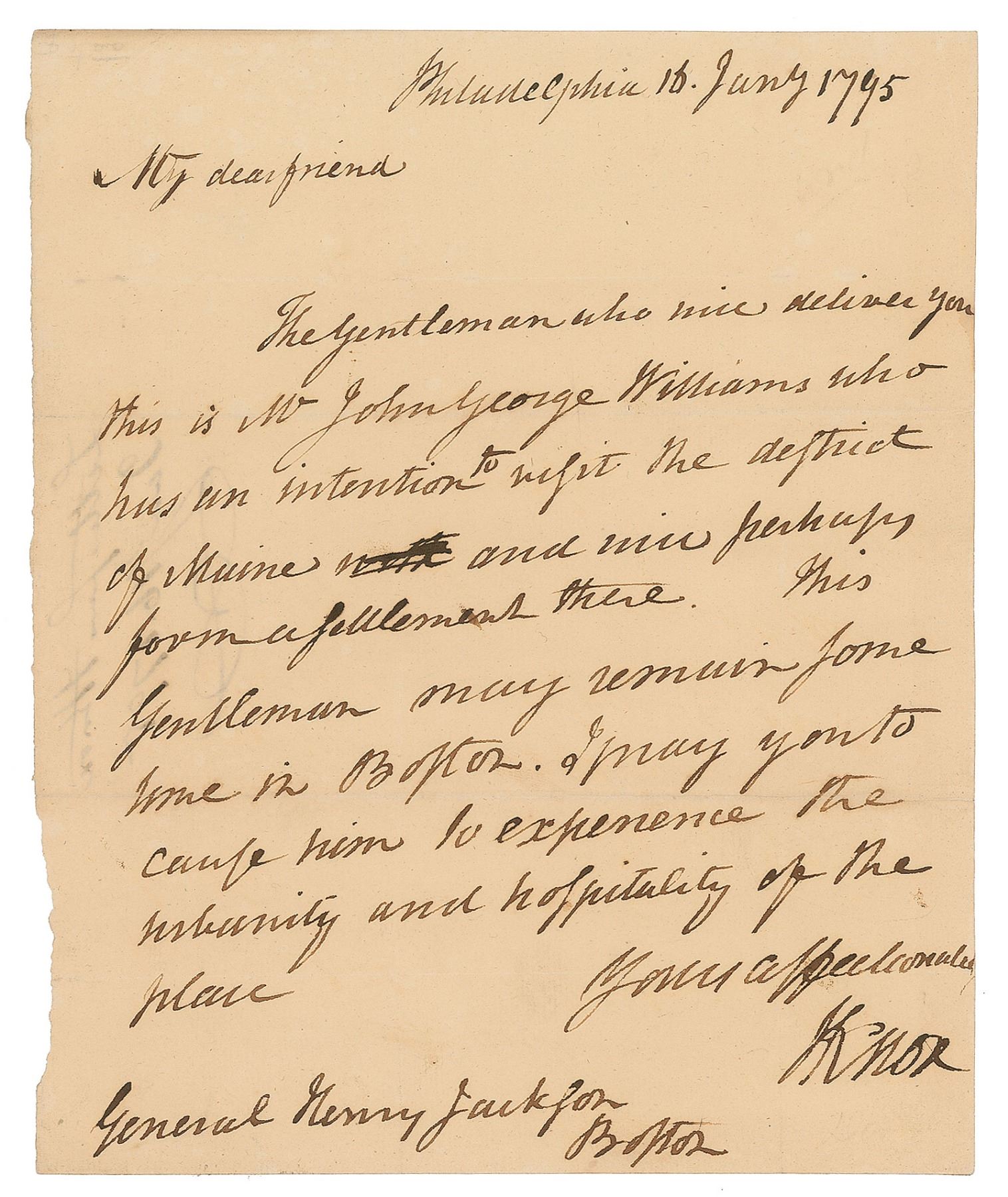 Revolutionary War general and founder of the military school that became West Point (1750–1806). ALS signed “H. Knox,” one page, 7.25 x 9, January 16, 1795. Letter to General Henry Jackson at Boston, in part: "The gentleman who will deliver you this is Mr. John George Williams who has an intention to visit the district of Maine and will perhaps form a settlement there. This Gentleman may remain some time in Boston. I pray you to cause him to experience the urbanity and hospitality of the place." In fine condition.