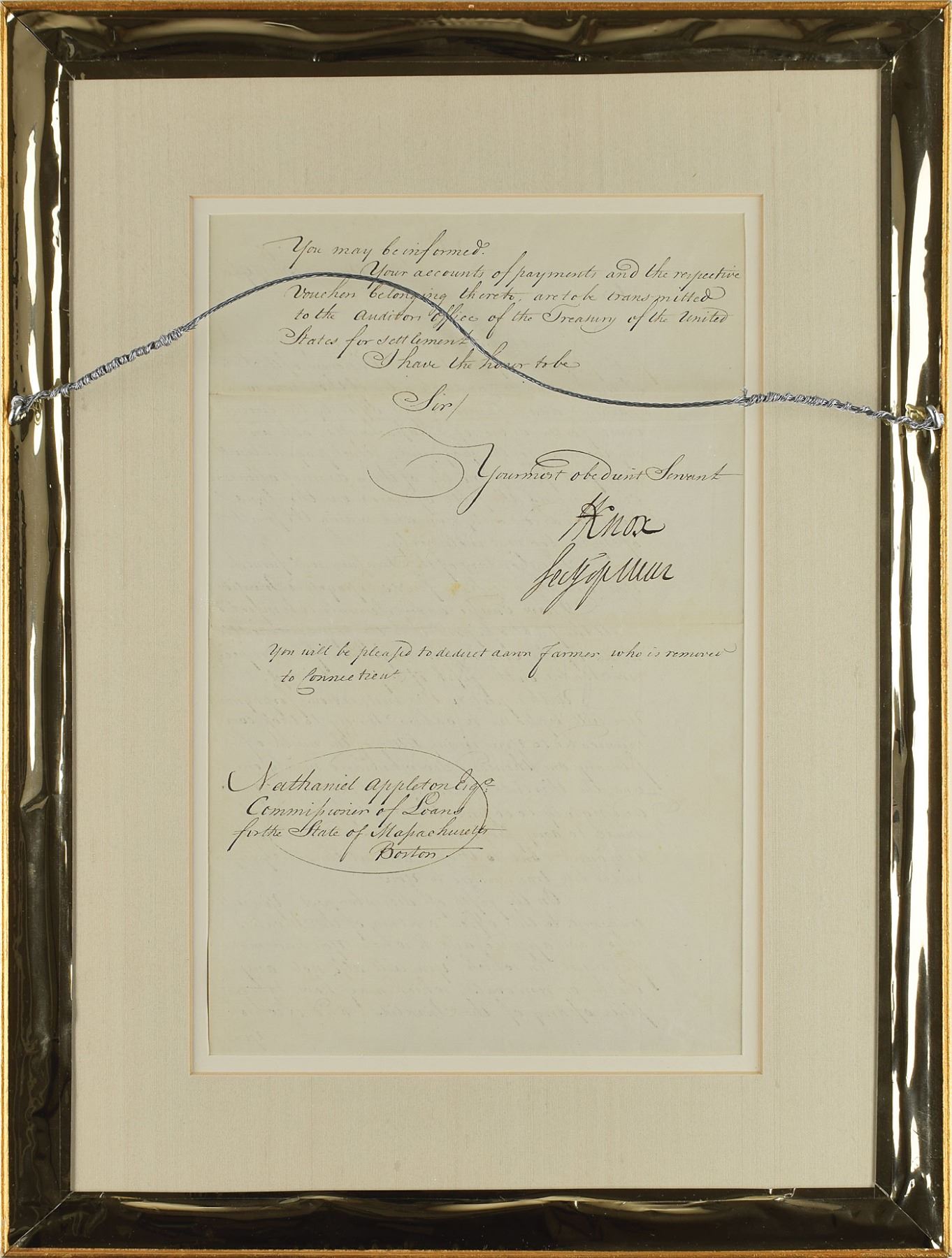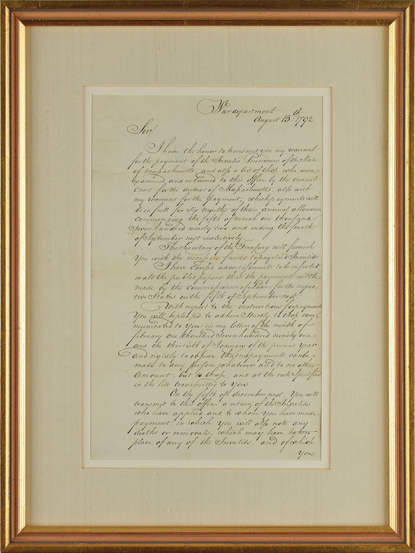 LS signed “H. Knox, Sec'y of War,” one page both sides, 7.75 x 12.25, August 13, 1792. Written from the War Department, a letter to Nathaniel Appleton, commissioner of land for the state of Massachusetts, in part: "I have the honor to transmit you my warrant for the payment of the Invalid Pensioners of the State of Massachusetts, and also a list of those who were examined and returned to the office by the circuit court for the district of Massachusetts, also with my warrant for the payment, which payments will be in full for six months of their annual allowance commencing the fifth of March one thousand seven hundred ninety two and ending the fourth of September next inclusively…On the fifth of December next, you will transmit to this office a return of the Invalids who have applied and to whom you have made payment, in which you will also note any deaths or removals." Cloth-matted and framed to an overall size of 14 x 18.25; backing of frame has a window for viewing reverse of letter. In fine condition.