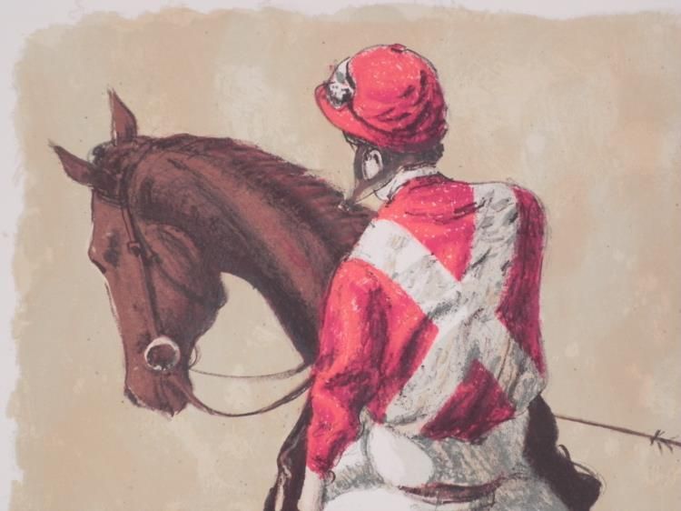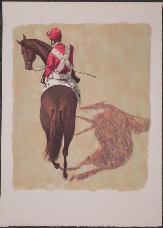 A jockey steers his horse up to the starting gate, perhaps, as an expressive shadow is cast on the ground. * * * Artist: Henry Koehler * Signature: In pencil, lower right * Medium: Lithograph on rag paper, deckled lower edge * Edition: Unnumbered artist's proof, marked "A.P." in pencil, lower center * Year: 1976 * Sheet size: 31 1/2 x 22 1/2 inches * Condition: Excellent; minor edge wear * * * Biography: * A sporting artist who lives in Southampton, New York, Henry Koehler was born in Louisville, Kentucky. He graduated from Yale University, and shortly after that had illustrations published by The New Yorker, Town and Country, and Sports Illustrated. * * A great group of three how fabulous will thee be framed??? and offered here at very reasonable opening bid.