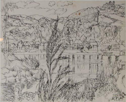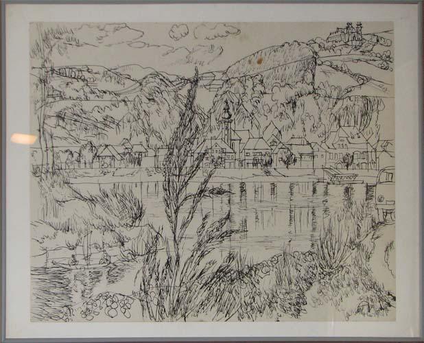 Henry Koerner Ink Drawing Lake Scene, Austria