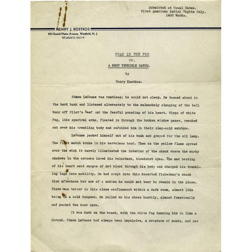<B>Henry Kostkos Typed Manuscript: <I>Fear In The Fog.</B></I></B></I> This lot features an unsigned typed manuscript written by Henry Kostkos. The manuscript is five pages long and contains 1400 words. The short story is about a man who is overcome with guilt about a drowning he witnessed. The climax and resolution this cataloguer will leave for you to find out! There are no notes or marks on the manuscript. It comes on Kostkos' personal stationery. <r<rThe manuscript is in fine condition, the only flaw being rust from a paper clip appearing on the first page and the verso of the last page. The usual folds are present. A nice lot for fans of this short story author!