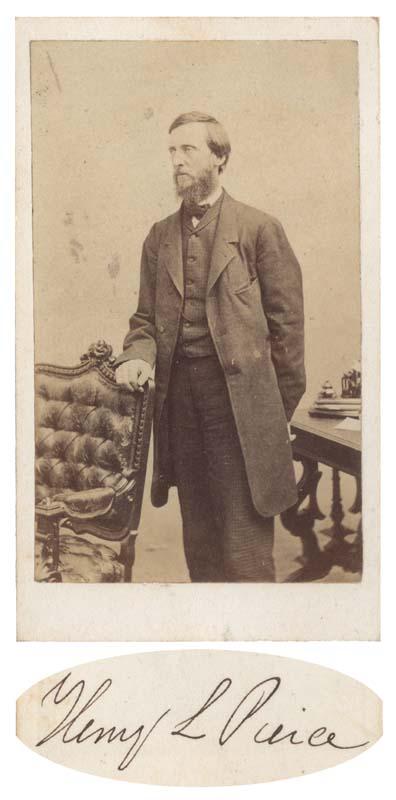 HENRY L. PIERCE (1825-1896) U.S. Representative from Massachusetts. Photograph of Pierce signed on verso, “Henry L. Pierce.” 2 1/2” x 4 1/4”. No place. No place. Backstamp reads, “J.W. Black 173 Washington St. Boston.” Fine.