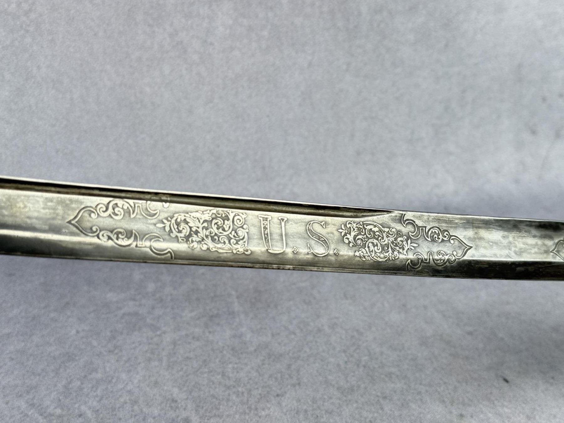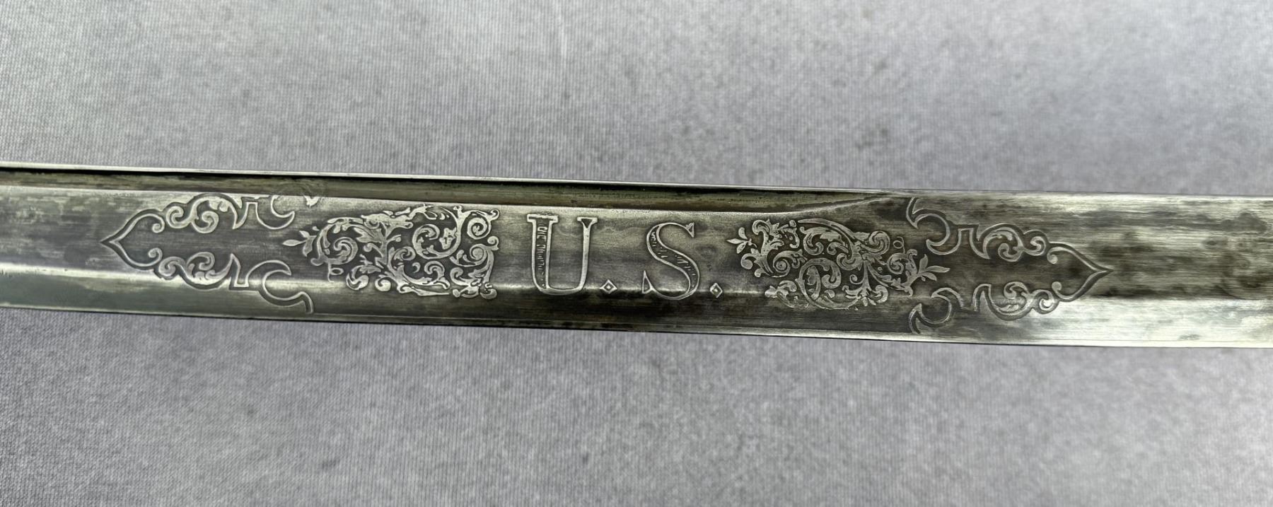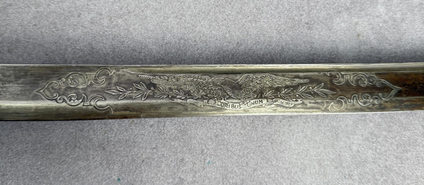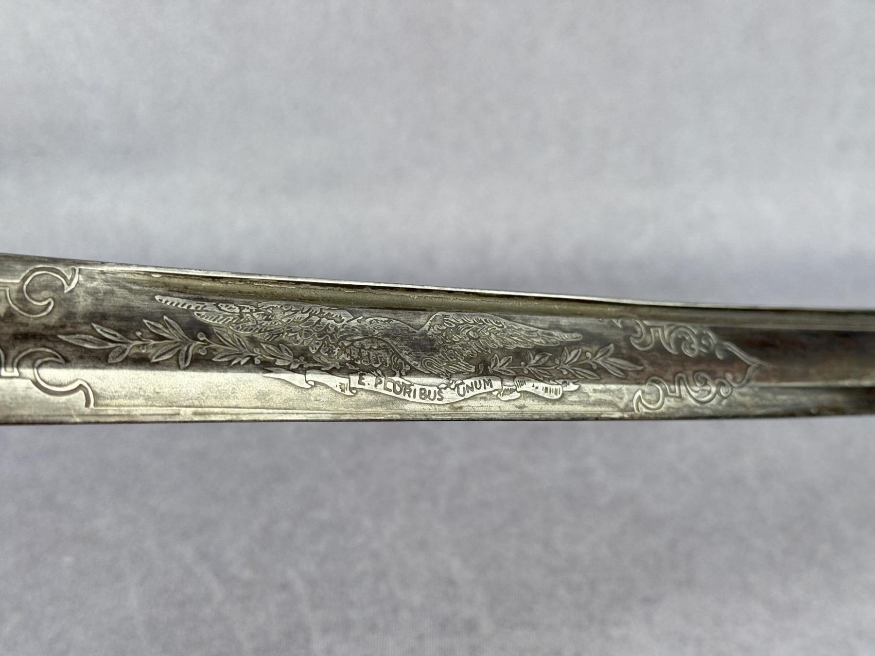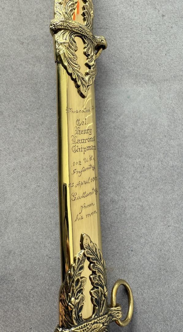 Made by P.D. Luneschloss (PDL) of Solingen. 38 3/4" long, Sterling Silver Handle, Gold Plated Hardware. Sword reads Col. Henry Laurens Chipman 102 USC Infantry 15 April 1865 Gallantly from his Men. Henry L. Chipman was the son of a Michigan Territorial Supreme Court Justice. He was born in Vermont in 1823 and moved to Detroit with his family in 1824. Chipman was Captain of the Detroit Light Guard Reserve in 1861. He entered service in the Civil War as Captain in the 11th U. S. Infantry on May 14, 1861. He was transferred to the 2nd Michigan Infantry on May 25, 1861 with the rank of Lt. Colonel. Chipman saw battle at Chancellorsville and Gettysburg. He was made Colonel of the 102nd Colored Infantry on April 15, 1864. He was brevetted Brigadier General on March 13, 1865. Chipman was mustered out of volunteer service on September 30, 1865. Following the war, he was made Major of the 3rd U. S. Infantry on May 19, 1881. He retired from military service on February 1, 1887.