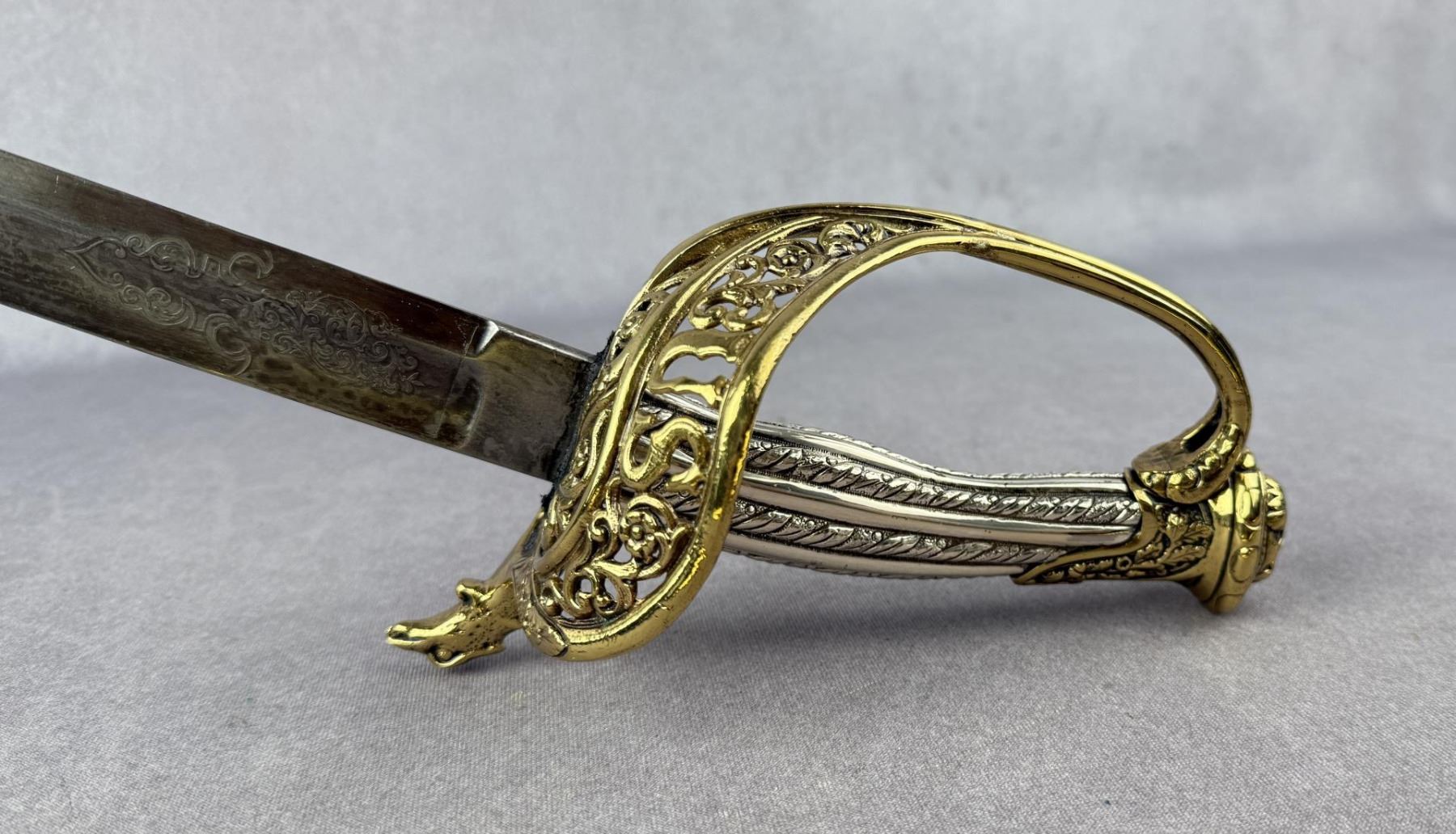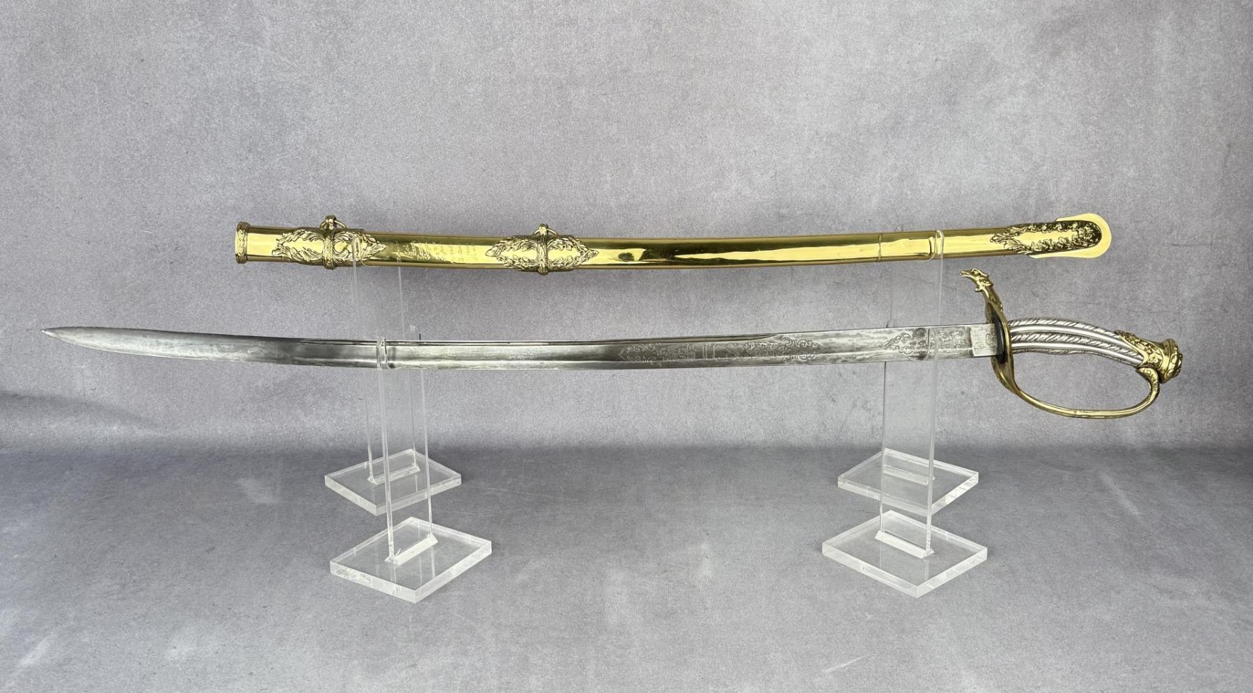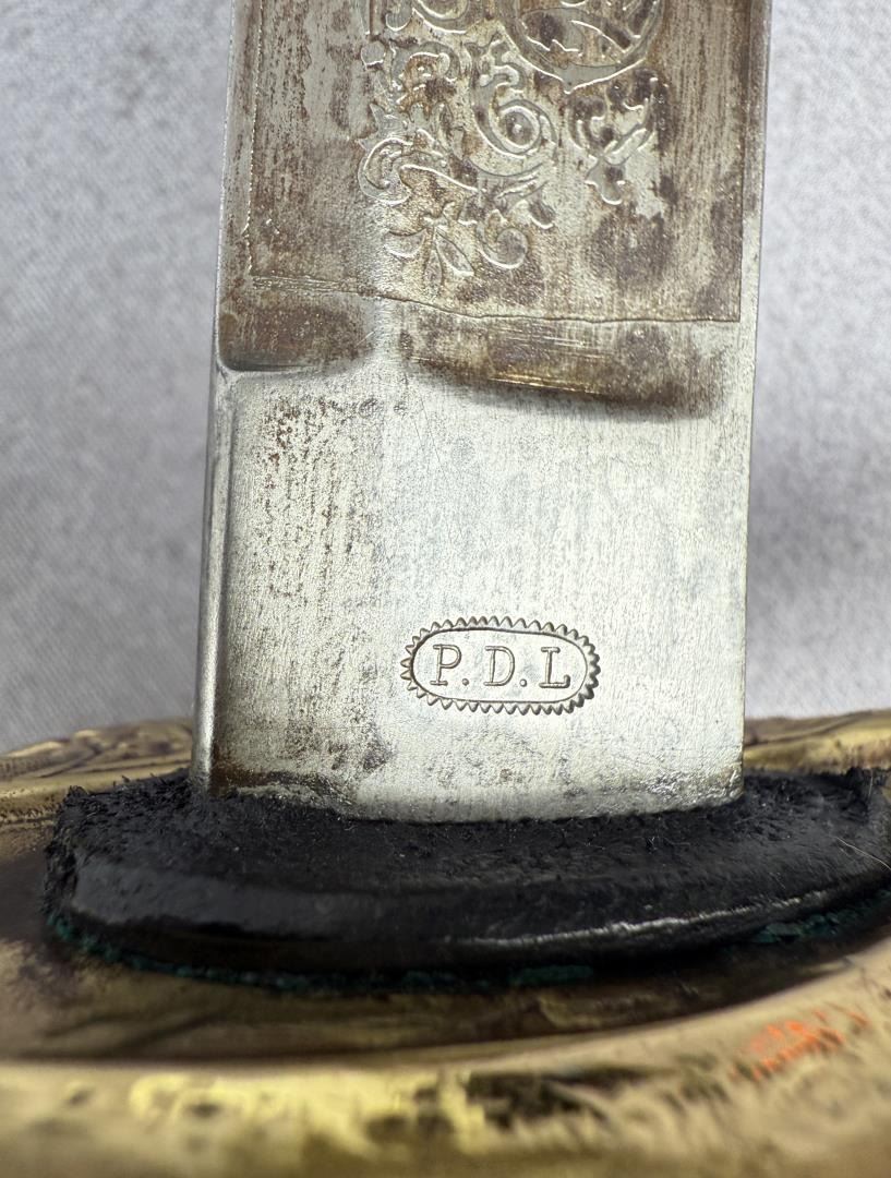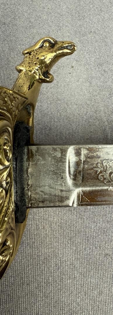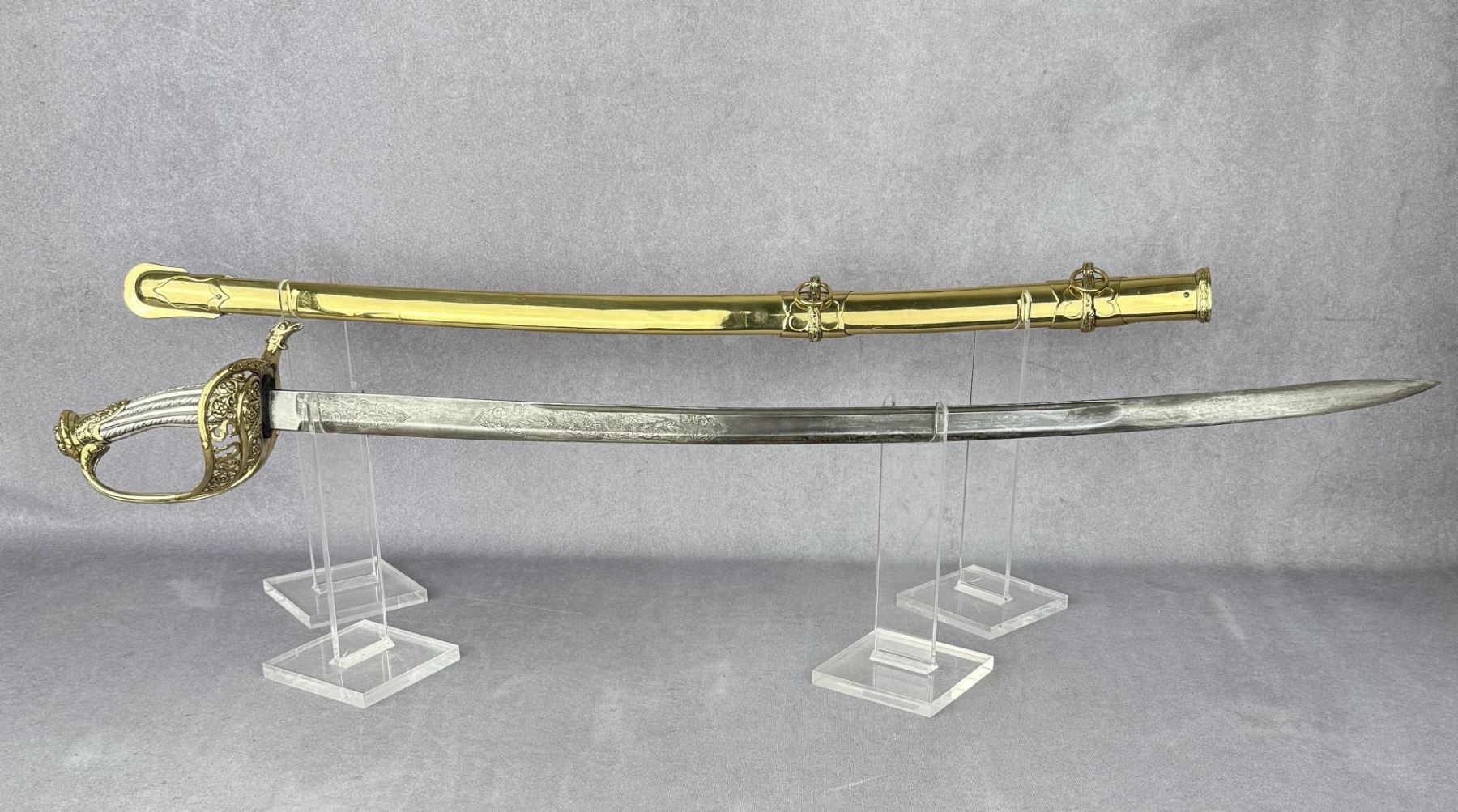 Made by P.D. Luneschloss (PDL) of Solingen. 38 3/4" long, Sterling Silver Handle, Gold Plated Hardware. Sword reads Col. Henry Laurens Chipman 102 USC Infantry 15 April 1865 Gallantly from his Men. Henry L. Chipman was the son of a Michigan Territorial Supreme Court Justice. He was born in Vermont in 1823 and moved to Detroit with his family in 1824. Chipman was Captain of the Detroit Light Guard Reserve in 1861. He entered service in the Civil War as Captain in the 11th U. S. Infantry on May 14, 1861. He was transferred to the 2nd Michigan Infantry on May 25, 1861 with the rank of Lt. Colonel. Chipman saw battle at Chancellorsville and Gettysburg. He was made Colonel of the 102nd Colored Infantry on April 15, 1864. He was brevetted Brigadier General on March 13, 1865. Chipman was mustered out of volunteer service on September 30, 1865. Following the war, he was made Major of the 3rd U. S. Infantry on May 19, 1881. He retired from military service on February 1, 1887.