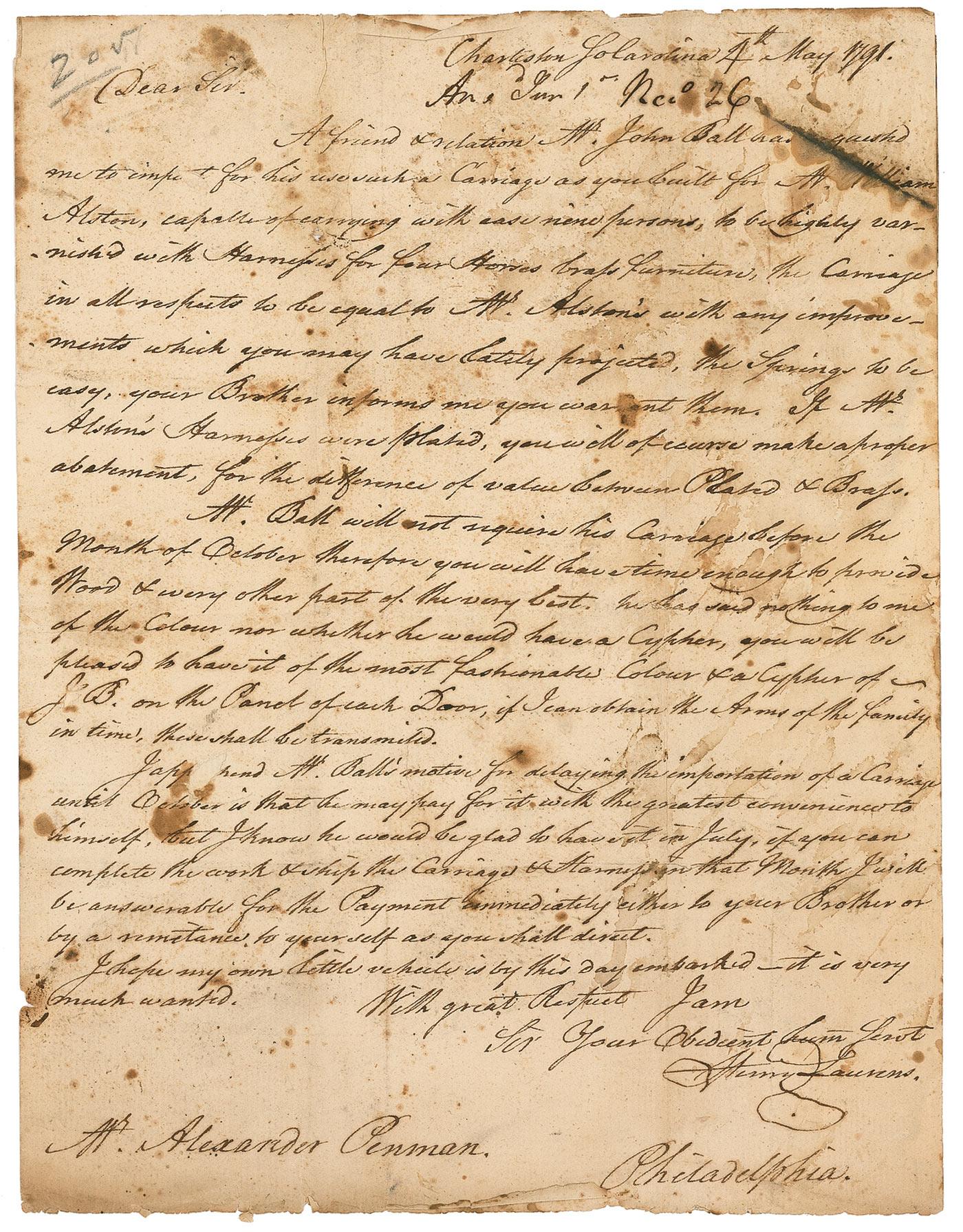 South Carolina statesman (1724–1792) who was a delegate to the Continental Congress, third President of the Second Continental Congress, Vice-President of South Carolina, and Minister to Holland. Captured by the British Navy on a return trip from the Netherlands to the United States during the Revolutionary War, Laurens was imprisoned in the Tower of London until he was released in exchange for General Lord Cornwallis. ALS, one page, 7.75 x 10, May 4, 1791. An interesting letter to coach maker Alexander Penman. In part: “A friend & relation Mr. John Ball has requested me to imply for his use such a Carriage as you built for Mr. William Alston, capable of carrying with ease nine persons, to be highly varnished with harnesses for four horses brass furniture. The Carriage in all respects to be equal to Mr. Alston’s with any improvements which you may have lately projected. The Springs to be easy…If Mr. Alston’s Harnesses were plated, you will of course make a proper abatement for the difference of value between Plated & Brass.