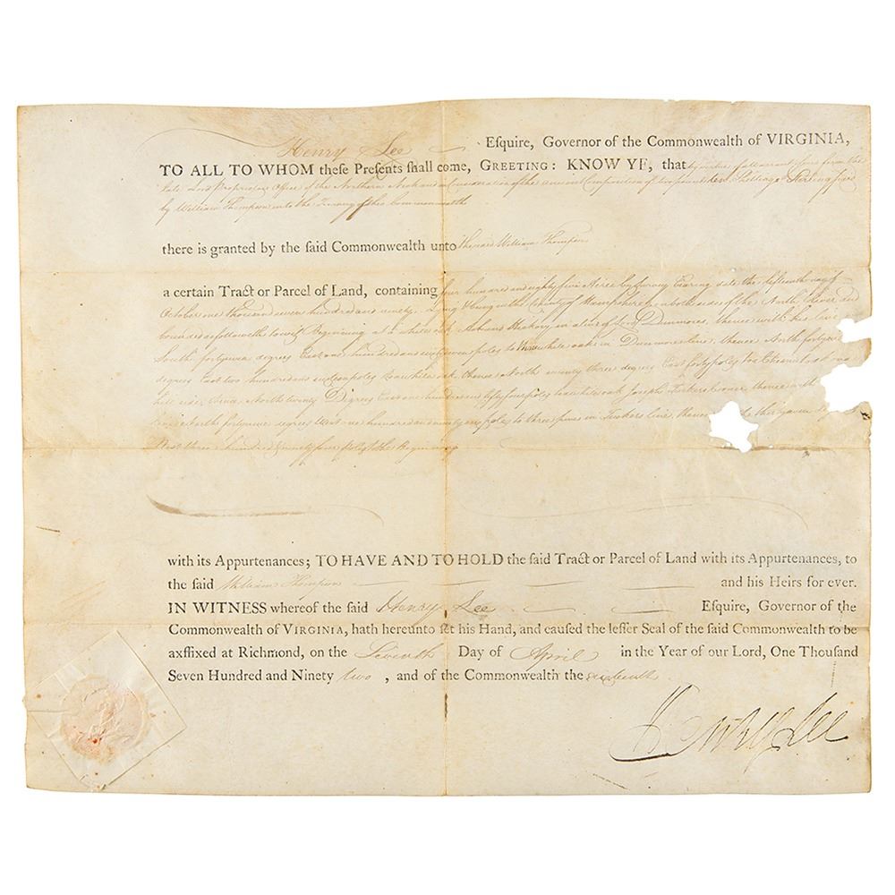 Partly-printed vellum DS, one page, 15 x 12.25, April 7, 1792. As governor of Virginia, Henry Lee grants William Thompson "a certain Tract or Parcel of Land, containing four hundred and eighty five Acres." Prominently signed at the conclusion in ink by Governor Lee. The white paper seal affixed to the lower left remains intact. In very good to fine condition, with areas of loss, affecting some of the text but not the large signature.