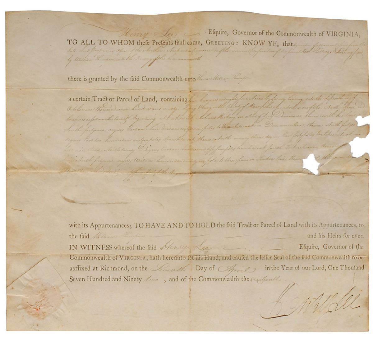 Revolutionary War hero (1756–1818) who captured British posts in New York and in the South; he was also the father of Robert E. Lee. Partly-printed vellum DS, one page, 15 x 12.25, April 7, 1792. As governor of Virginia, Lee grants William Thompson "a certain Tract or Parcel of Land, containing four hundred and eighty five Acres." Prominently signed in the lower right by Lee. The white paper seal affixed to the lower left remains fully intact. In very good to fine condition, with scattered toning and areas of paper, none affecting Lee's huge signature. Accompanied by an unsigned engraving. Pre-certified PSA/DNA.