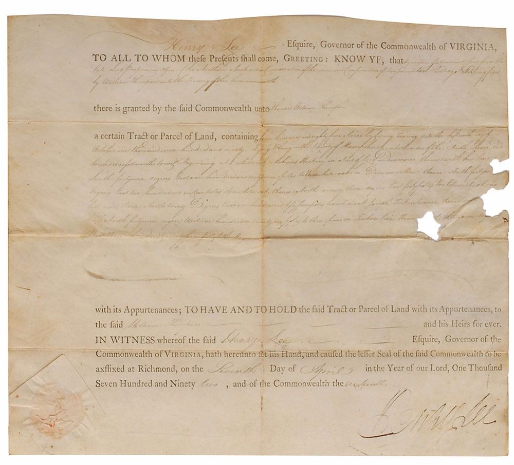 Revolutionary War hero (1756–1818) who captured British posts in New York and in the South; he was also the father of Robert E. Lee. Partly-printed vellum DS, one page, 15 x 12.25, April 7, 1792. As governor of Virginia, Lee grants William Thompson "a certain Tract or Parcel of Land, containing four hundred and eighty five Acres." Prominently signed in the lower right by Lee. The white paper seal affixed to the lower left remains fully intact. In very good to fine condition, with scattered toning and areas of paper, none affecting Lee's huge signature. Accompanied by an unsigned engraving.