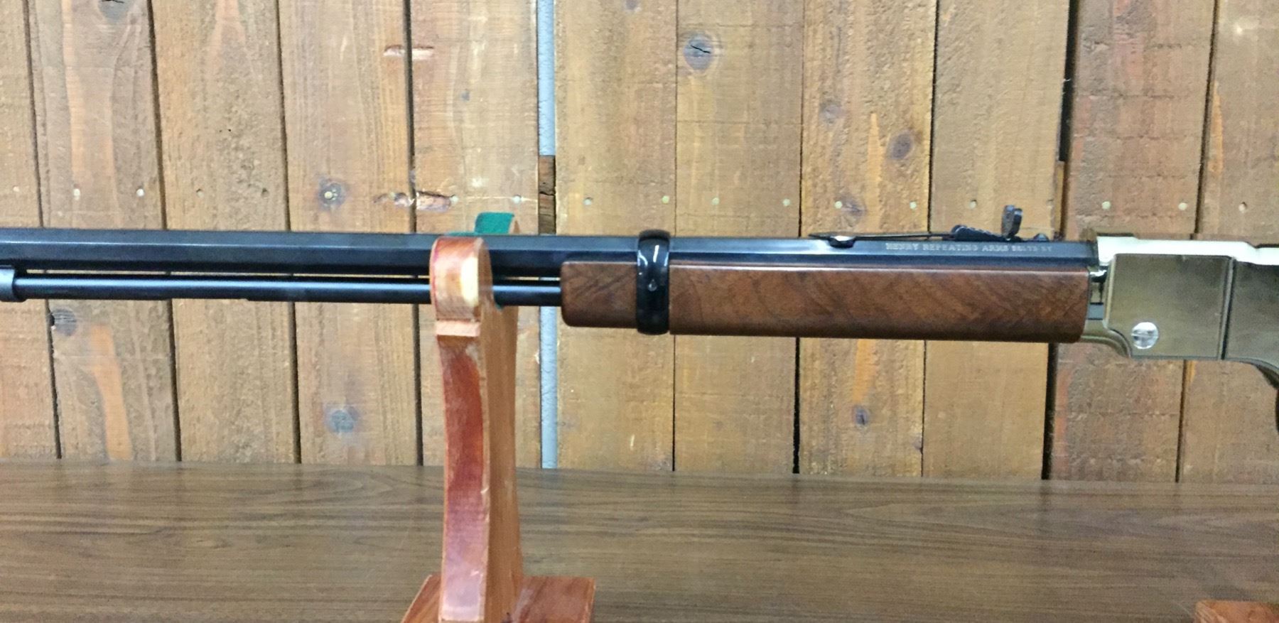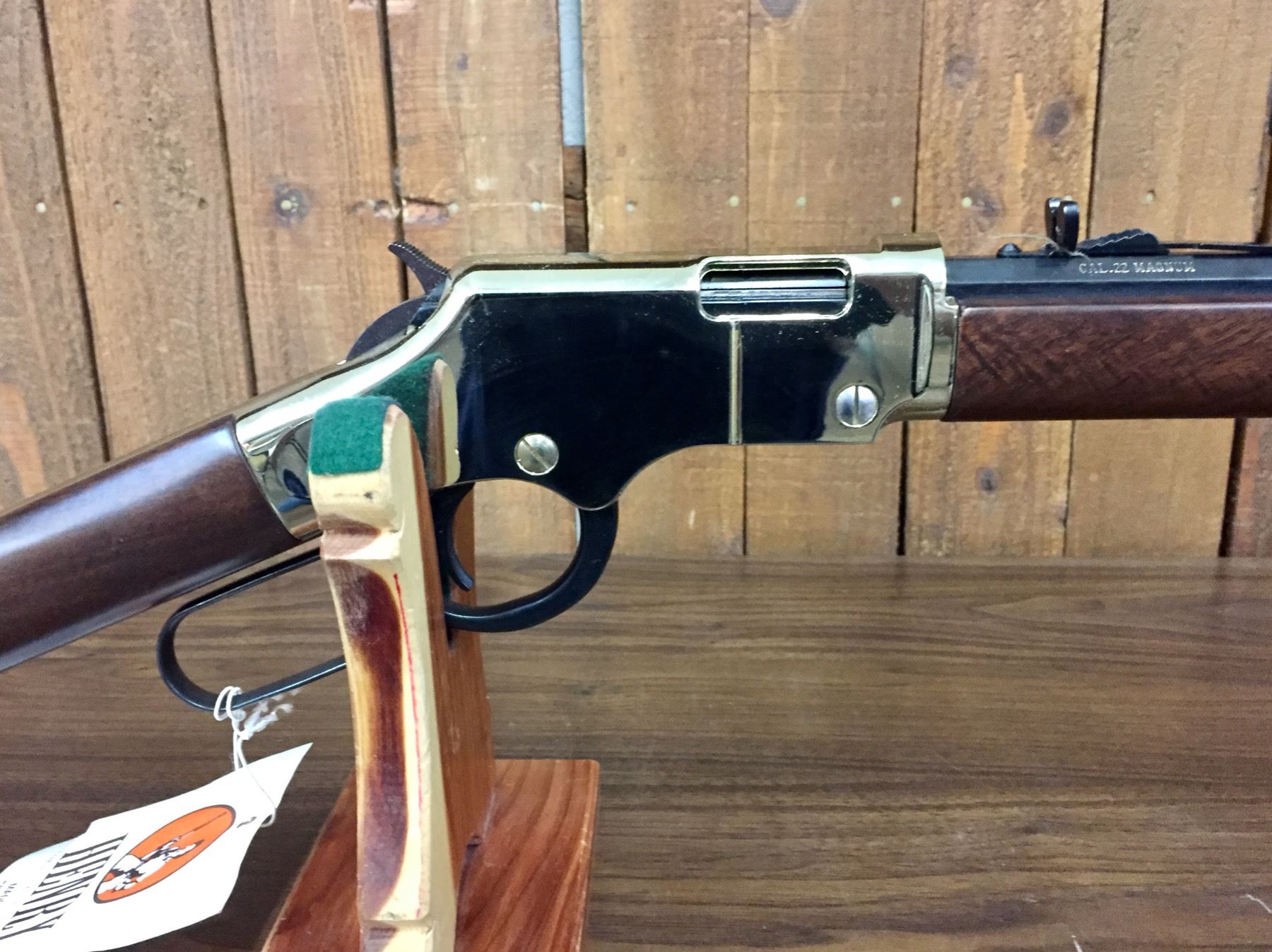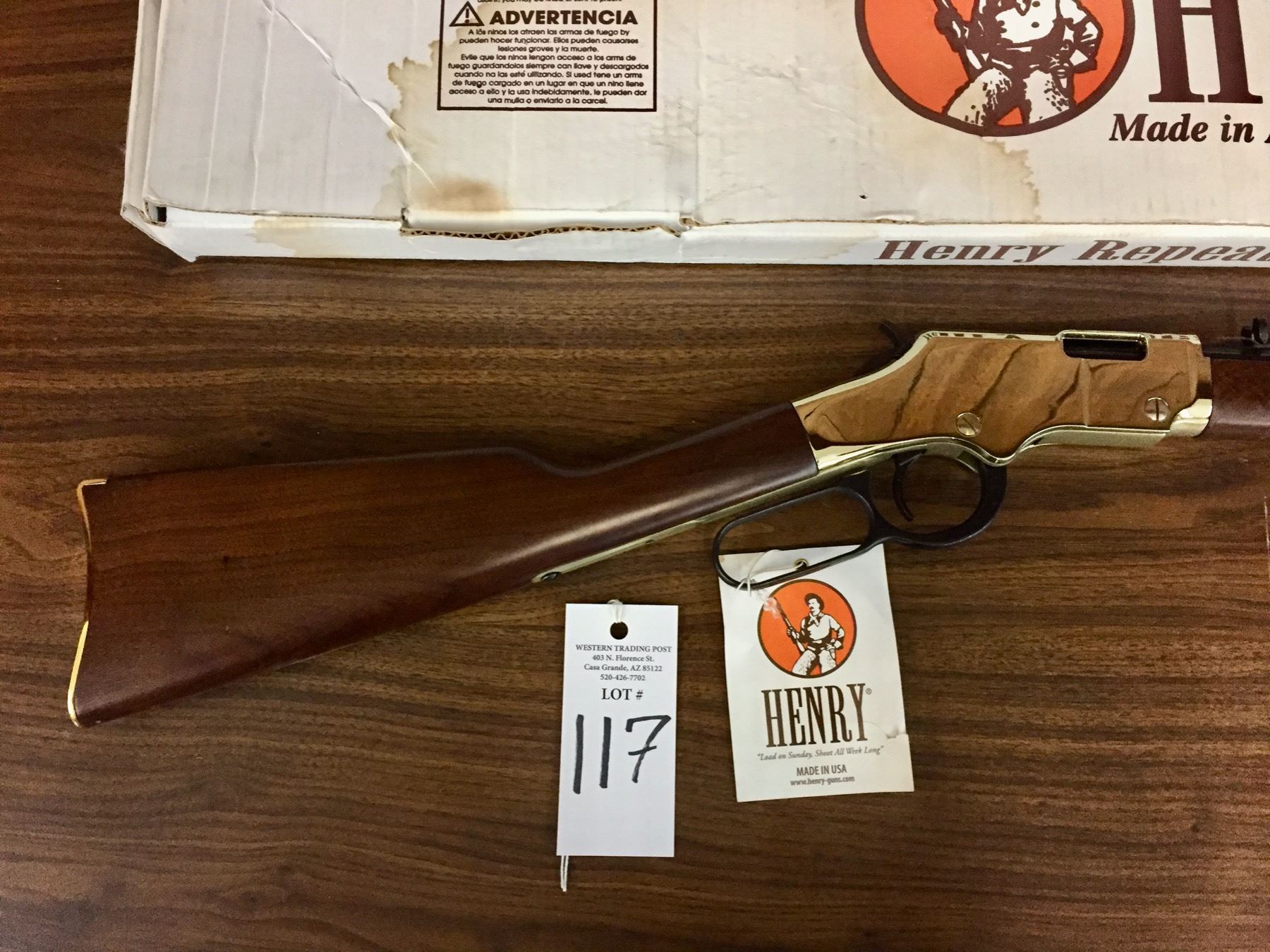 Description: For your consideration we offer for sale in this lot a Henry Lever Action .22 caliber rifle with original box. Appears to be in like new condition with only shelf and handling wear evident. Box is ok, but not perfect. Maker: Henry Repeating Arms. Approx. Age: Vintage. Serial No. GB047244M. Size: Barrel measures 20-1/2†with an overall length of 39â€. Condition: Good for its age, minor wear expected. Please look closely at the pictures - they are an important part of our description. Shipping: There will be a $15 handling / packaging fee for shipping this lot. The actual cost of postage will be added on top of that. *****This firearm REQUIRES an FFL Transfer*****