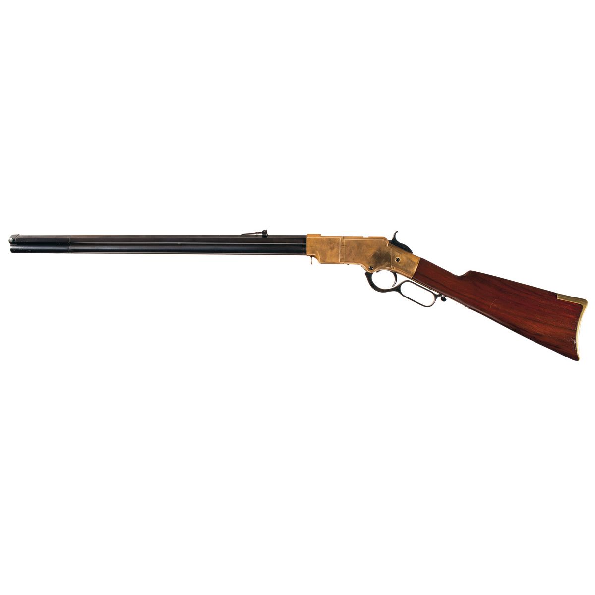 Manufactured in 1864. The top barrel flat is marked with the two line Henry's patent/address, with the rear sight in the center and the top flat at the breech is marked "465". Brass blade front sight and folding ladder rear sight graduated to 1,000 yards. Brass receiver with the sight dovetail and mounted with a smooth pistol grip stock with the early style brass round heel buttplate.