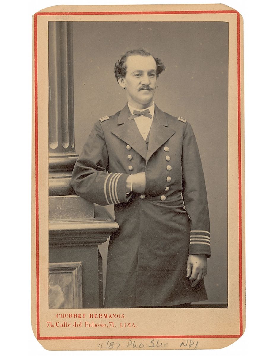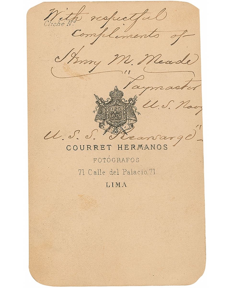 Naval officer who served as part of the North Atlantic Blockading Squadron and nephew of General George Meade. Original 2.5 x 4 three-quarter length carte-de-visite photo by Hermanos of Lima, Peru, signed on the reverse in black ink, “With respectful compliments of Henry M. Meade, Paymaster U. S. Navy, U.S.S. Kearsarge.” Clipped corner tips, small pencil notations to bottom border, and some light soiling to reverse, otherwise fine condition.