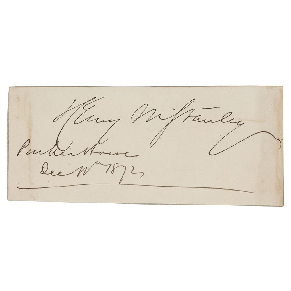 Ink signature, "Henry M. Stanley, Parker House, Dec. 11, 1872,†on an off-white 5.75 x 2.5 slip affixed to a same-size sheet. In fine condition, with light toning along the side edges from old mounting remnants on the back.