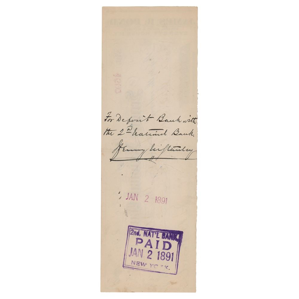 Personal bank check belonging to noted lecture promoter James B. Pond, 8.25 x 2.75, filled out and signed by Pond, payable to Henry M. Stanley for $500, December 29, 1890. Endorsed on the reverse in fountain pen, "For Deposit Bank with the 2nd National Bank, Henry M. Stanley." In fine condition.