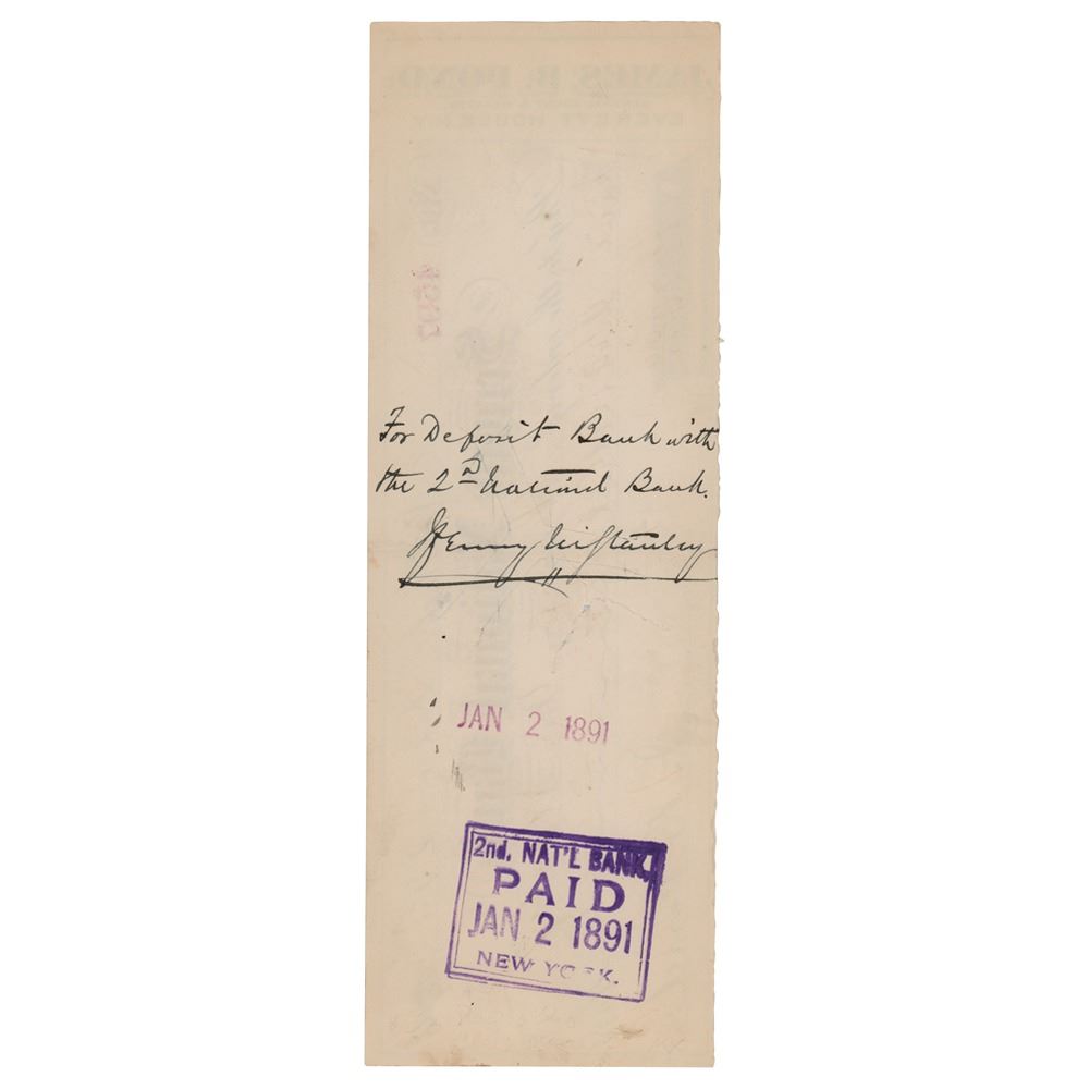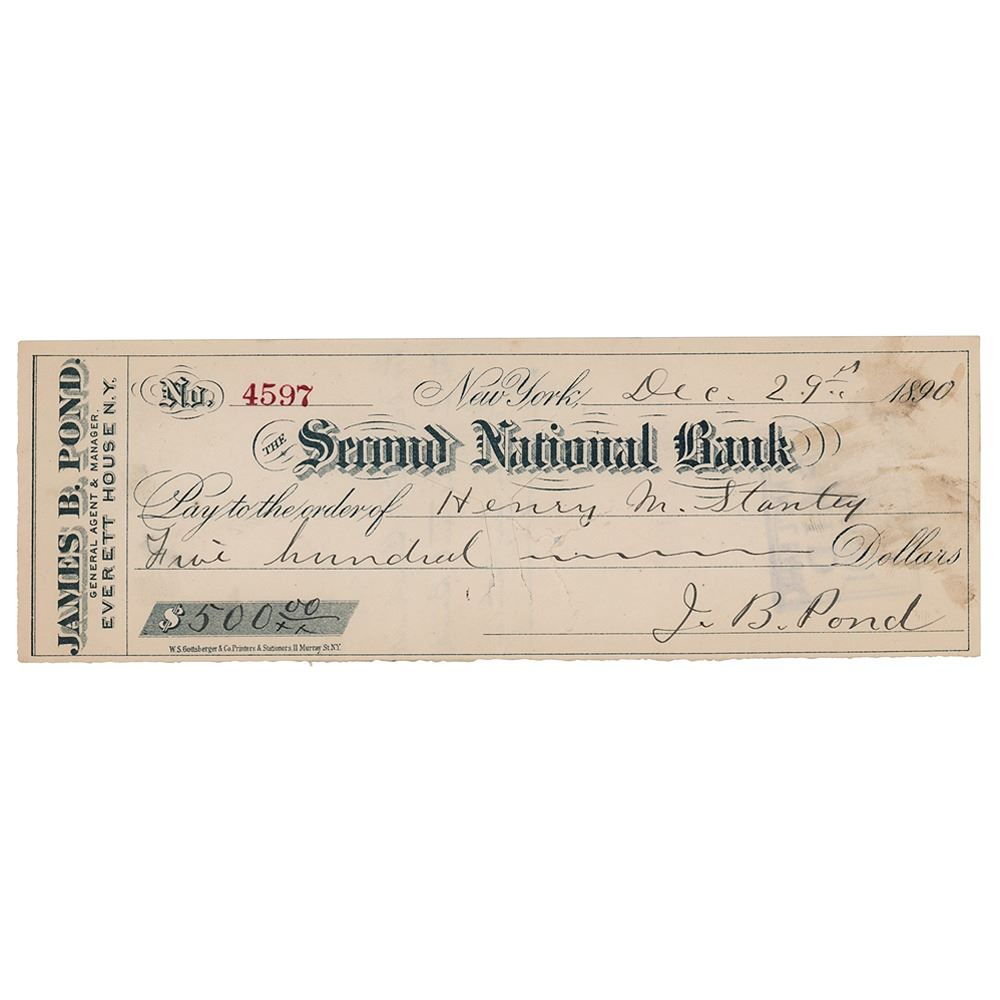 Personal bank check belonging to noted lecture promoter James B. Pond, 8.25 x 2.75, filled out and signed by Pond, payable to Henry M. Stanley for $500, December 29, 1890. Endorsed on the reverse in fountain pen, "For Deposit Bank with the 2nd National Bank, Henry M. Stanley." In fine condition.