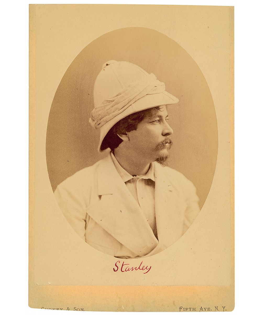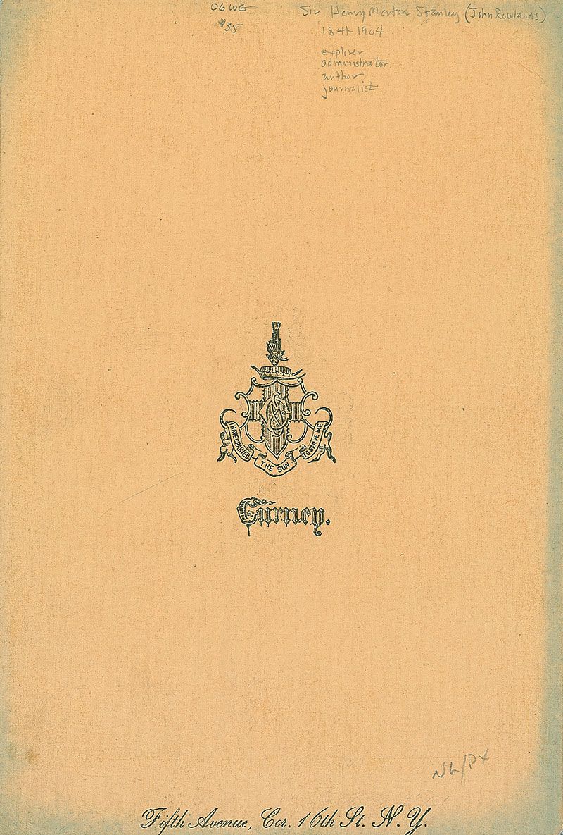 Author, explorer, and special correspondent for the New York Herald (1841–1904). He entered the annals of popular quotation with his famous inquiry, ‘Dr. Livingstone, I presume?,’ upon finding David Livingstone, a Scottish missionary and fellow explorer who had become lost in the wilds of Zanzibar. Unsigned original 4.25 x 6.25 cabinet photo of Stanley wearing his pith helmet, by Gurney & Son of New York. Trimmed top and bottom edges, and an ink notation to the bottom of the image, otherwise fine condition.