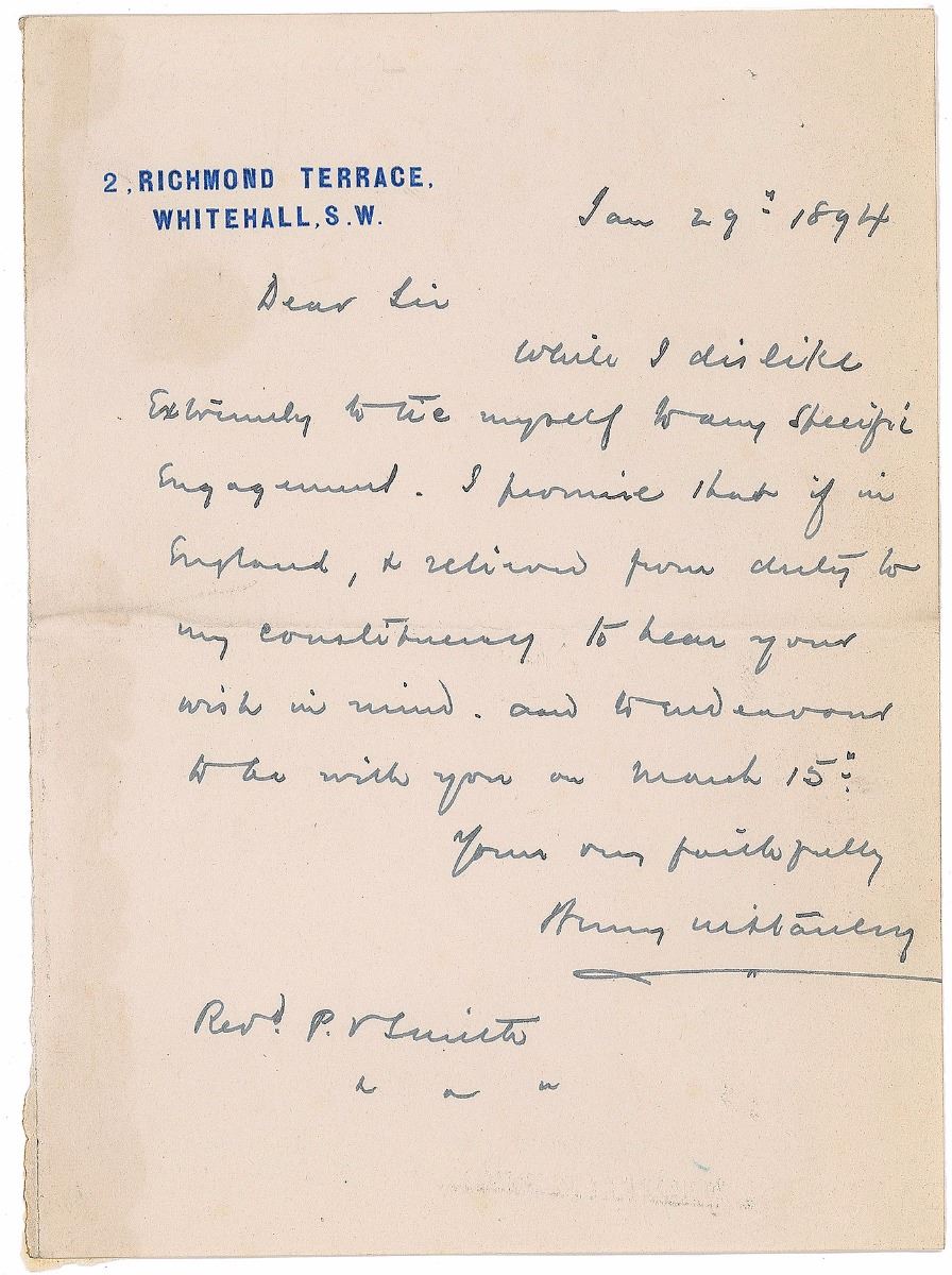 ALS, one page, 4.75 x 6.5, Richmond Terrace letterhead, January 29, 1894. Letter to a reverend, in part: “While I dislike extremely to tie myself to any specific engagement, I promise that if in England…to endeavour to be with you on March 15.” In fine condition, with toning along the left edge from old mounting remnants on the reverse.