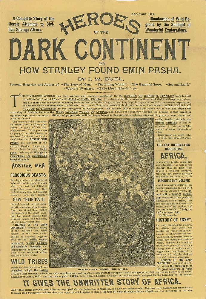 Publisher's advertisement for Heroes of the Dark Continent and How Stanley Found Emin Pasha by J. W. Buel, published by the Historical Publishing Co. in 1889, four pages, 11.25 x 16.5, featuring a descriptive text with ten illustrations, as well as a price list and subscription information. The advertisement promises tales of "hostile men and ferocious beasts," "wild tribes," "wondrous animals," "explorers, adventurers, hunters and missionaries," and "splendid discoveries." It states: "The expedition of Stanley, carrying us over a period of three years, is made the crowning feature of this grand book, and without invidious comparison we may justly claim the description, as here given, the most exciting, captivating, instructive, and altogether the most fascinating narrative that has ever been published." In very good to fine condition, with intersecting folds and moderate handling wear. In addition to an overview of African history, customs, and geography, Buel's sensationalist book provided an engrossing account of intrepid explorer Henry Stanley's quest for colonial governor Emin Pasha in 1886.