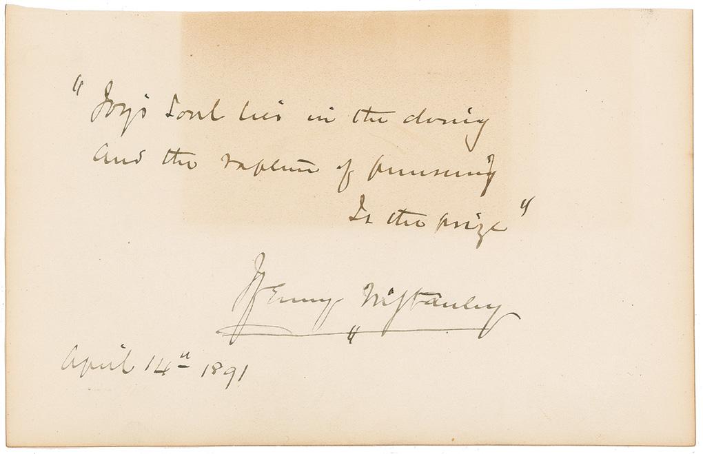 American-born author, explorer, and special correspondent for the New York Herald (1841–1904). He entered the annals of popular quotation with his famous inquiry, “Dr. Livingstone, I presume?,” upon finding David Livingstone, a Scottish missionary and fellow explorer who had become lost in the wilds of Zanzibar. AQS on an off-white 7.5 x 4.75 album page. Stanley channels a mix of Shakespeare and Longfellow as he quotes: “Joy lies in the doing, And the rapture of pursuing, Is the prize.” Signed underneath, “Henry M. Stanley, April 14th, 1891.” Light block of toning over most of the quote, otherwise fine condition.