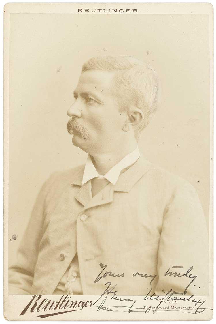 American-born author, explorer, and special correspondent for the New York Herald (1841–1904). He entered the annals of popular quotation with his famous inquiry, “Dr. Livingstone, I presume?,” upon finding David Livingstone, a Scottish missionary and fellow explorer who had become lost in the wilds of Zanzibar. Scarce original vintage 4.25 x 6.5 French cabinet photo by Charles Reutlinger of Paris, and so stamped on reverse, signed along the bottom in fountain pen, “Yours very truly, Henry M. Stanley.” In very good condition, with several postmark impressions along left edge, some minor restoration to back portion of hairline and a few stray ink marks to background. Uncommon in this format. Pre-certified PSA/DNA and RRAuction COA.